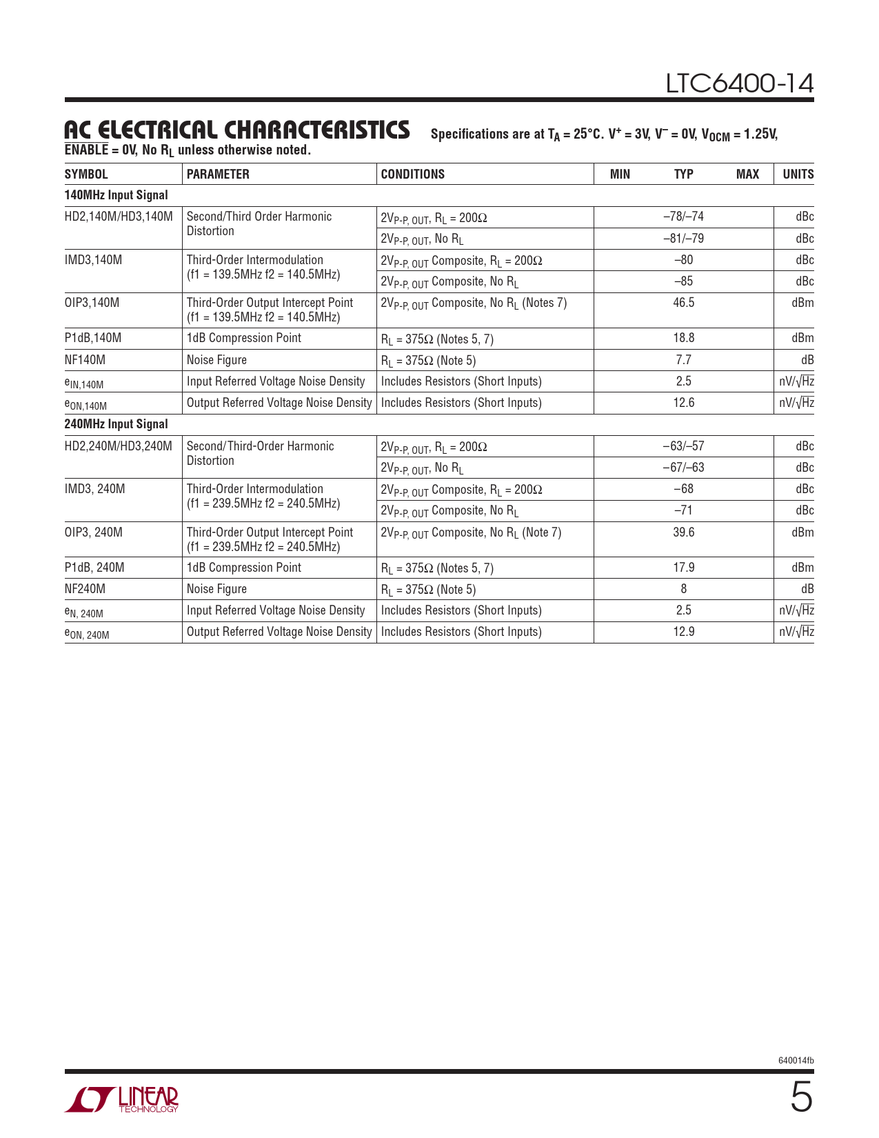HD2,240M/HD3,240M Second/Third-Order Harmonic 2VP-P, OUT, RL = 200Ω –63/–57 dBc Distortion 2VP-P, OUT, No RL –67/–63 dBc IMD3, 240M Third-Order Intermodulation 2VP-P, OUT Composite, RL = 200Ω –68 dBc (f1 = 239.5MHz f2 = 240.5MHz) 2VP-P, OUT Composite, No RL –71 dBc OIP3, 240M Third-Order Output Intercept Point 2VP-P, OUT Composite, No RL (Note 7) 39.6 dBm (f1 = 239.5MHz f2 = 240.5MHz) P1dB, 240M 1dB Compression Point RL = 375Ω (Notes 5, 7) 17.9 dBm NF240M Noise Figure RL = 375Ω (Note 5) 8 dB eN, 240M Input Referred Voltage Noise Density Includes Resistors (Short Inputs) 2.5 nV/√Hz eON, 240M Output Referred Voltage Noise Density Includes Resistors (Short Inputs) 12.9 nV/√Hz 640014fb 5