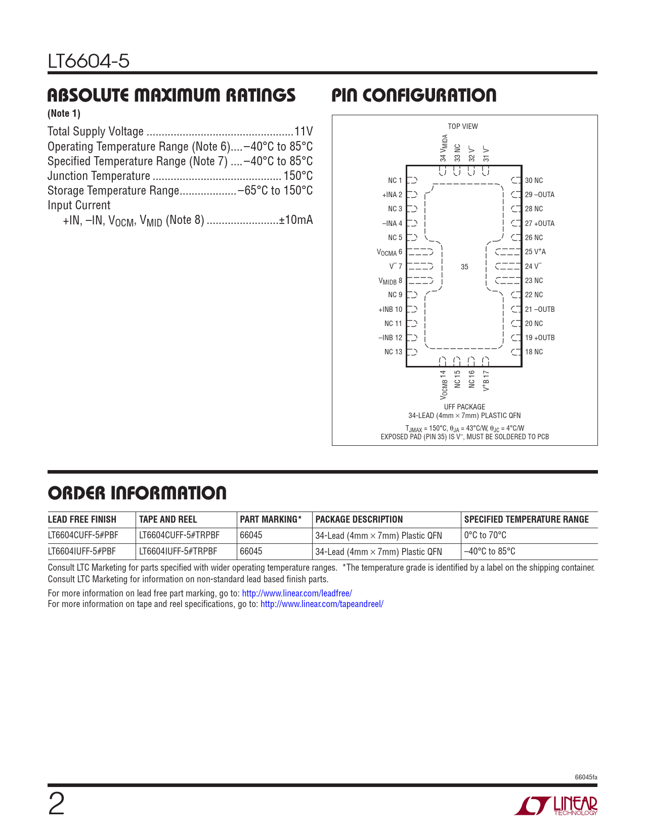 LT6604CUFF-5#PBF LT6604CUFF-5#TRPBF 66045 34-Lead (4mm × 7mm) Plastic QFN 0°C to 70°C LT6604IUFF-5#PBF LT6604IUFF-5#TRPBF 66045 34-Lead (4mm × 7mm) Plastic QFN –40°C to 85°C Consult LTC Marketing for parts specifi ed with wider operating temperature ranges. *The temperature grade is identifi ed by a label on the shipping container. Consult LTC Marketing for information on non-standard lead based fi nish parts. For more information on lead free part marking, go to: http://www.linear.com/leadfree/ For more information on tape and reel specifi cations, go to: http://www.linear.com/tapeandreel/ 66045fa 2