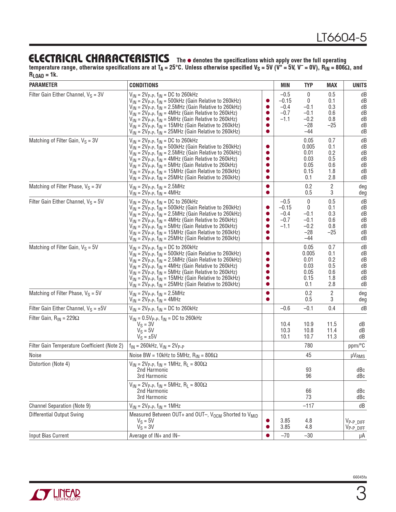 Filter Gain Either Channel, VS = 3V VIN = 2VP-P, fIN = DC to 260kHz –0.5 0 0.5 dB VIN = 2VP-P, fIN = 500kHz (Gain Relative to 260kHz) l –0.15 0 0.1 dB VIN = 2VP-P, fIN = 2.5MHz (Gain Relative to 260kHz) l –0.4 –0.1 0.3 dB VIN = 2VP-P, fIN = 4MHz (Gain Relative to 260kHz) l –0.7 –0.1 0.6 dB VIN = 2VP-P, fIN = 5MHz (Gain Relative to 260kHz) l –1.1 –0.2 0.8 dB VIN = 2VP-P, fIN = 15MHz (Gain Relative to 260kHz) l –28 –25 dB VIN = 2VP-P, fIN = 25MHz (Gain Relative to 260kHz) l –44 dB Matching of Filter Gain, VS = 3V VIN = 2VP-P, fIN = DC to 260kHz 0.05 0.7 dB VIN = 2VP-P, fIN = 500kHz (Gain Relative to 260kHz) l 0.005 0.1 dB VIN = 2VP-P, fIN = 2.5MHz (Gain Relative to 260kHz) l 0.01 0.2 dB VIN = 2VP-P, fIN = 4MHz (Gain Relative to 260kHz) l 0.03 0.5 dB VIN = 2VP-P, fIN = 5MHz (Gain Relative to 260kHz) l 0.05 0.6 dB VIN = 2VP-P, fIN = 15MHz (Gain Relative to 260kHz) l 0.15 1.8 dB VIN = 2VP-P, fIN = 25MHz (Gain Relative to 260kHz) l 0.1 2.8 dB Matching of Filter Phase, VS = 3V VIN = 2VP-P, fIN = 2.5MHz l 0.2 2 deg VIN = 2VP-P, fIN = 4MHz l 0.5 3 deg Filter Gain Either Channel, VS = 5V VIN = 2VP-P, fIN = DC to 260kHz –0.5 0 0.5 dB VIN = 2VP-P, fIN = 500kHz (Gain Relative to 260kHz) l –0.15 0 0.1 dB VIN = 2VP-P, fIN = 2.5MHz (Gain Relative to 260kHz) l –0.4 –0.1 0.3 dB VIN = 2VP-P, fIN = 4MHz (Gain Relative to 260kHz) l –0.7 –0.1 0.6 dB VIN = 2VP-P, fIN = 5MHz (Gain Relative to 260kHz) l –1.1 –0.2 0.8 dB VIN = 2VP-P, fIN = 15MHz (Gain Relative to 260kHz) l –28 –25 dB VIN = 2VP-P, fIN = 25MHz (Gain Relative to 260kHz) l –44 dB Matching of Filter Gain, VS = 5V VIN = 2VP-P, fIN = DC to 260kHz 0.05 0.7 dB VIN = 2VP-P, fIN = 500kHz (Gain Relative to 260kHz) l 0.005 0.1 dB VIN = 2VP-P, fIN = 2.5MHz (Gain Relative to 260kHz) l 0.01 0.2 dB VIN = 2VP-P, fIN = 4MHz (Gain Relative to 260kHz) l 0.03 0.5 dB VIN = 2VP-P, fIN = 5MHz (Gain Relative to 260kHz) l 0.05 0.6 dB VIN = 2VP-P, fIN = 15MHz (Gain Relative to 260kHz) l 0.15 1.8 dB VIN = 2VP-P, fIN = 25MHz (Gain Relative to 260kHz) l 0.1 2.8 dB Matching of Filter Phase, VS = 5V VIN = 2VP-P, fIN = 2.5MHz l 0.2 2 deg VIN = 2VP-P, fIN = 4MHz l 0.5 3 deg Filter Gain Either Channel, VS = ±5V VIN = 2VP-P, fIN = DC to 260kHz –0.6 –0.1 0.4 dB Filter Gain, RIN = 229Ω VIN = 0.5VP-P, fIN = DC to 260kHz VS = 3V 10.4 10.9 11.5 dB VS = 5V 10.3 10.8 11.4 dB VS = ±5V 10.1 10.7 11.3 dB Filter Gain Temperature Coeffi cient (Note 2) fIN = 260kHz, VIN = 2VP-P 780 ppm/°C Noise Noise BW = 10kHz to 5MHz, RIN = 806Ω 45 μVRMS Distortion (Note 4) VIN = 2VP-P, fIN = 1MHz, RL = 800Ω 2nd Harmonic 93 dBc 3rd Harmonic 96 dBc VIN = 2VP-P, fIN = 5MHz, RL = 800Ω 2nd Harmonic 66 dBc 3rd Harmonic 73 dBc Channel Separation (Note 9) VIN = 2VP-P, fIN = 1MHz –117 dB Differential Output Swing Measured Between OUT+ and OUT–, VOCM Shorted to VMID VS = 5V l 3.85 4.8 VP-P_DIFF VS = 3V l 3.85 4.8 VP-P_DIFF Input Bias Current Average of IN+ and IN– l –70 –30 μA 66045fa 3