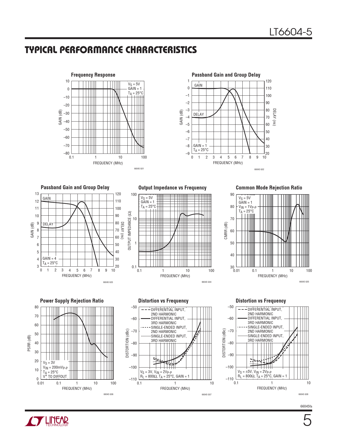 10 1 120 VS = 5V GAIN 0 GAIN = 1 0 110 TA = 25°C –1 –10 100 –2 90 –20 DELAY (ns) –3 80 –30 DELAY –4 70 –40 GAIN (dB) GAIN (dB) –5 60 –50 –6 50 –60 –7 40 –70 –8 GAIN = 1 30 TA = 25°C –80 –9 20 0.1 1 10 100 0 1 2 3 4 5 6 7 8 9 10 FREQUENCY (MHz) FREQUENCY (MHz) 66045 G01 66045 G02