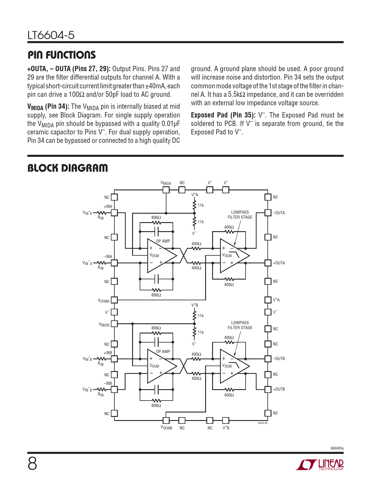 V– NC V– VMIDA V+A NC NC 11k +INA V + LOWPASS IN A –OUTA RIN 806Ω FILTER STAGE 11k 400Ω V– NC NC OP AMP 400Ω + – + – V V OCM OCM –INA V – IN A – + – + +OUTA RIN 400Ω NC NC 400Ω 806Ω VOCMA V+A V+B V– V– 11k LOWPASS VMIDB 806Ω FILTER STAGE NC 11k 400Ω NC V– NC OP AMP +INB 400Ω V + IN B + – + –OUTB – RIN V V OCM OCM + NC – – + NC 400Ω –INB V – +OUTB IN B RIN 400Ω 806Ω NC NC 66045 BD VOCMB NC NC V+B 66045fa 8