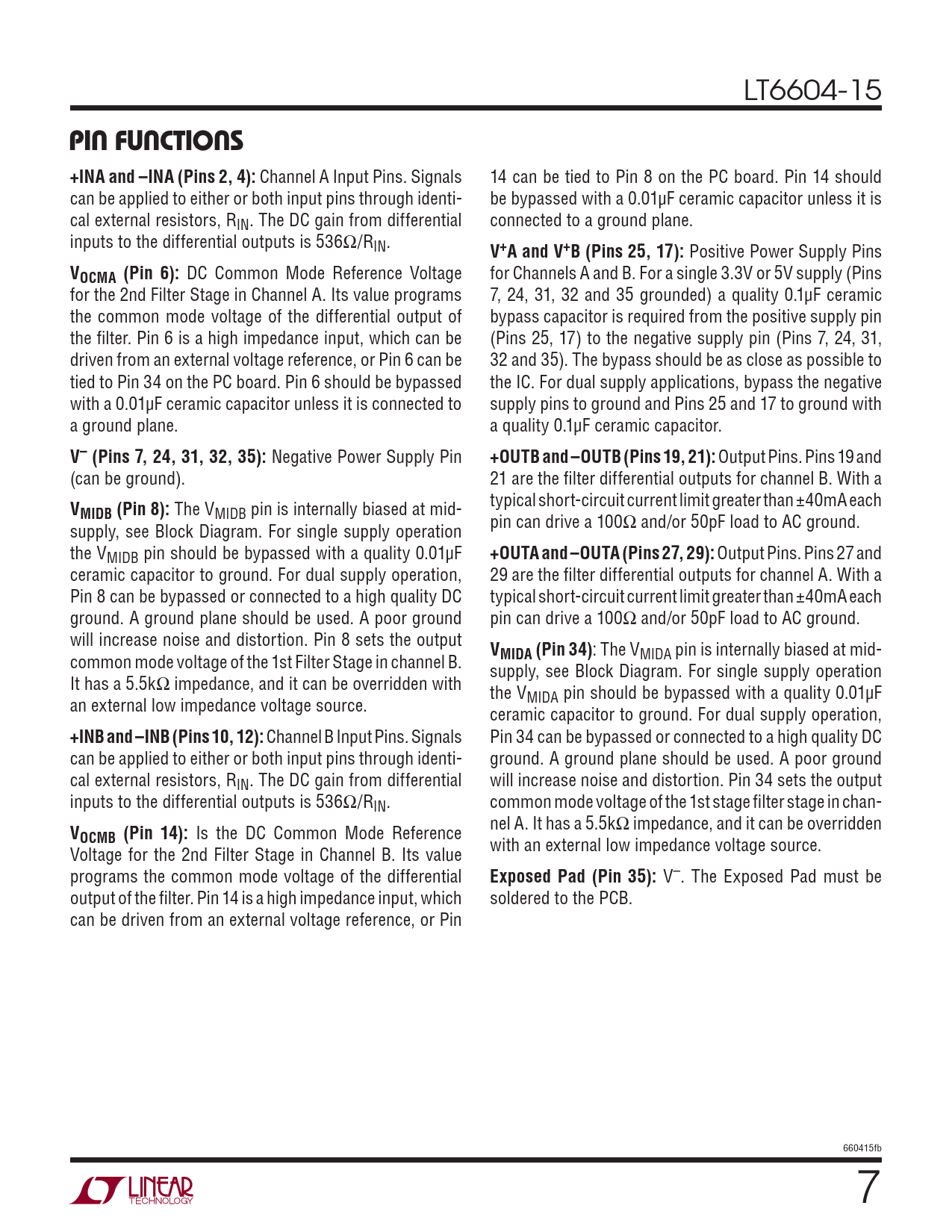 PIN FUNCTIONS +INA and –INA (Pins 2, 4): V+A and V+B (Pins 25, 17): VOCMA (Pin 6): V– (Pins 7, 24, 31, 32, 35):