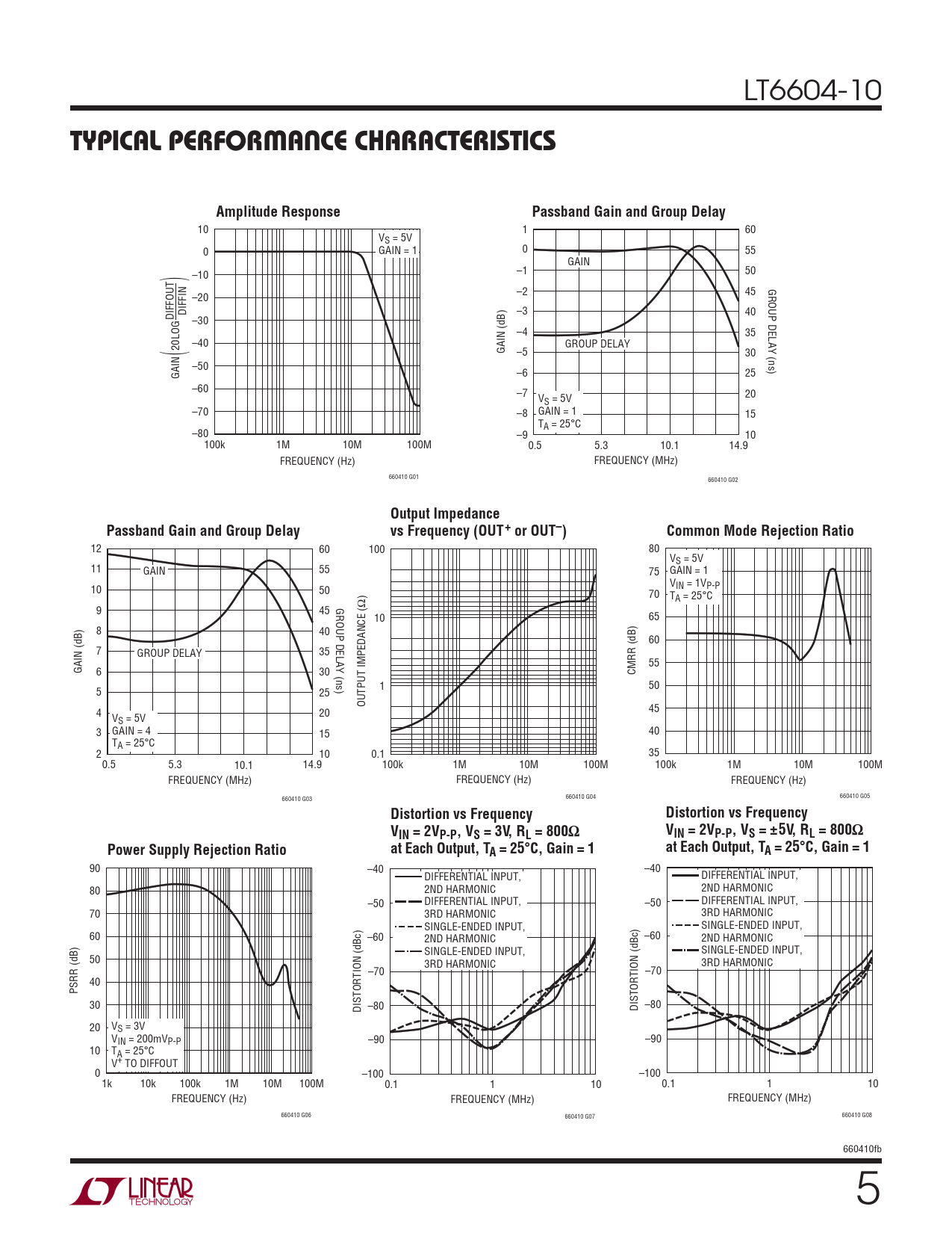 12 60 100 80 VS = 5V 11 GAIN 55 75 GAIN = 1 V 10 50 IN = 1VP-P 70 TA = 25°C GROUP DELAY (ns) 9 45 10 65 8 40 60 7 GROUP DELAY 35 55 GAIN (dB) 6 30 CMRR (dB) 1 50 5 25 OUTPUT IMPEDANCE (Ω) 4 20 45 VS = 5V 3 GAIN = 4 15 40 TA = 25°C 2 10 0.1 35 0.5 5.3 10.1 14.9 100k 1M 10M 100M 100k 1M 10M 100M FREQUENCY (MHz) FREQUENCY (Hz) FREQUENCY (Hz) 660410 G03 660410 G04 660410 G05