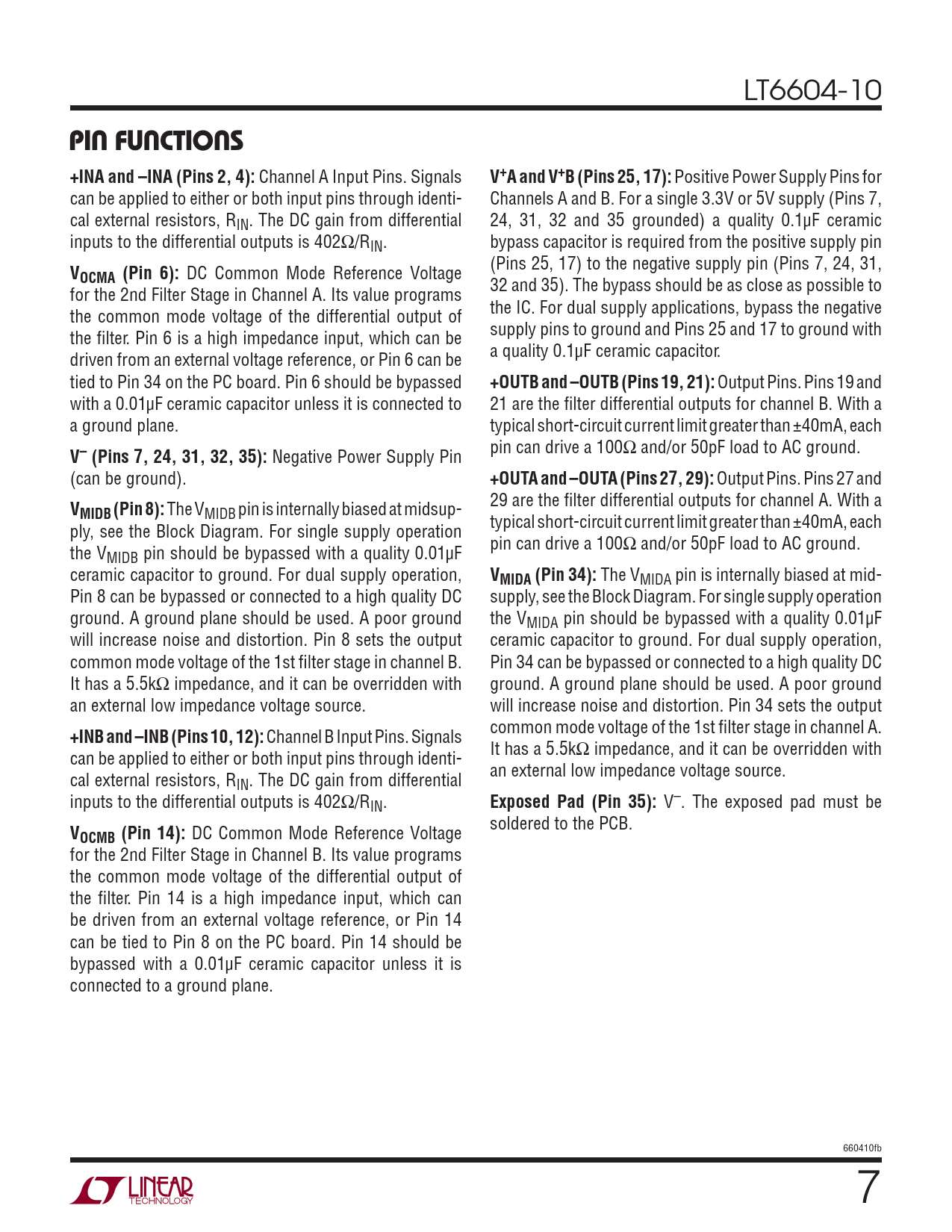 DC Common Mode Reference Voltage for the 2nd Filter Stage in Channel B. Its value programs the common mode voltage of the differential output of the fi lter. Pin 14 is a high impedance input, which can be driven from an external voltage reference, or Pin 14 can be tied to Pin 8 on the PC board. Pin 14 should be bypassed with a 0.01μF ceramic capacitor unless it is connected to a ground plane. 660410fb 7