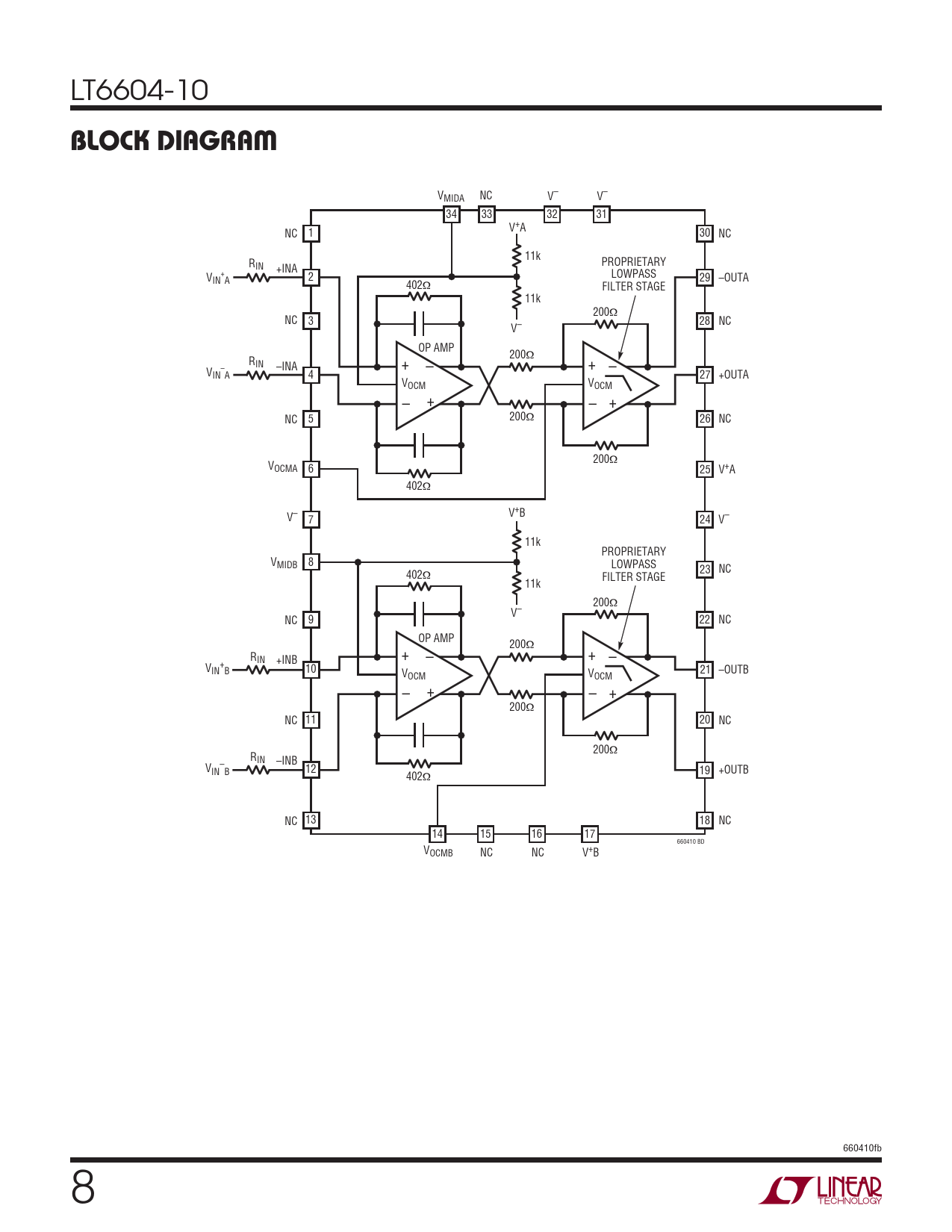 NC V– V– VMIDA 34 33 32 31 V+A NC 1 30 NC 11k R PROPRIETARY IN +INA + LOWPASS VIN A 2 29 –OUTA 402Ω FILTER STAGE 11k 200Ω NC 3 28 NC V– OP AMP R – IN –INA + 200Ω V – + – IN A 4 27 +OUTA VOCM VOCM – + – + 5 200Ω NC 26 NC 200Ω VOCMA 6 25 V+A 402Ω V+B V– 7 24 V– 11k PROPRIETARY VMIDB 8 LOWPASS 23 NC 402Ω 11k FILTER STAGE 200Ω V– NC 9 22 NC OP AMP 200Ω RIN +INB + – + – V + IN B 10 21 –OUTB VOCM VOCM – + – + 200Ω NC 11 20 NC 200 R Ω IN –INB V – IN B 12 19 +OUTB 402Ω NC 13 18 NC 14 15 16 17 660410 BD VOCMB NC NC V+B 660410fb 8