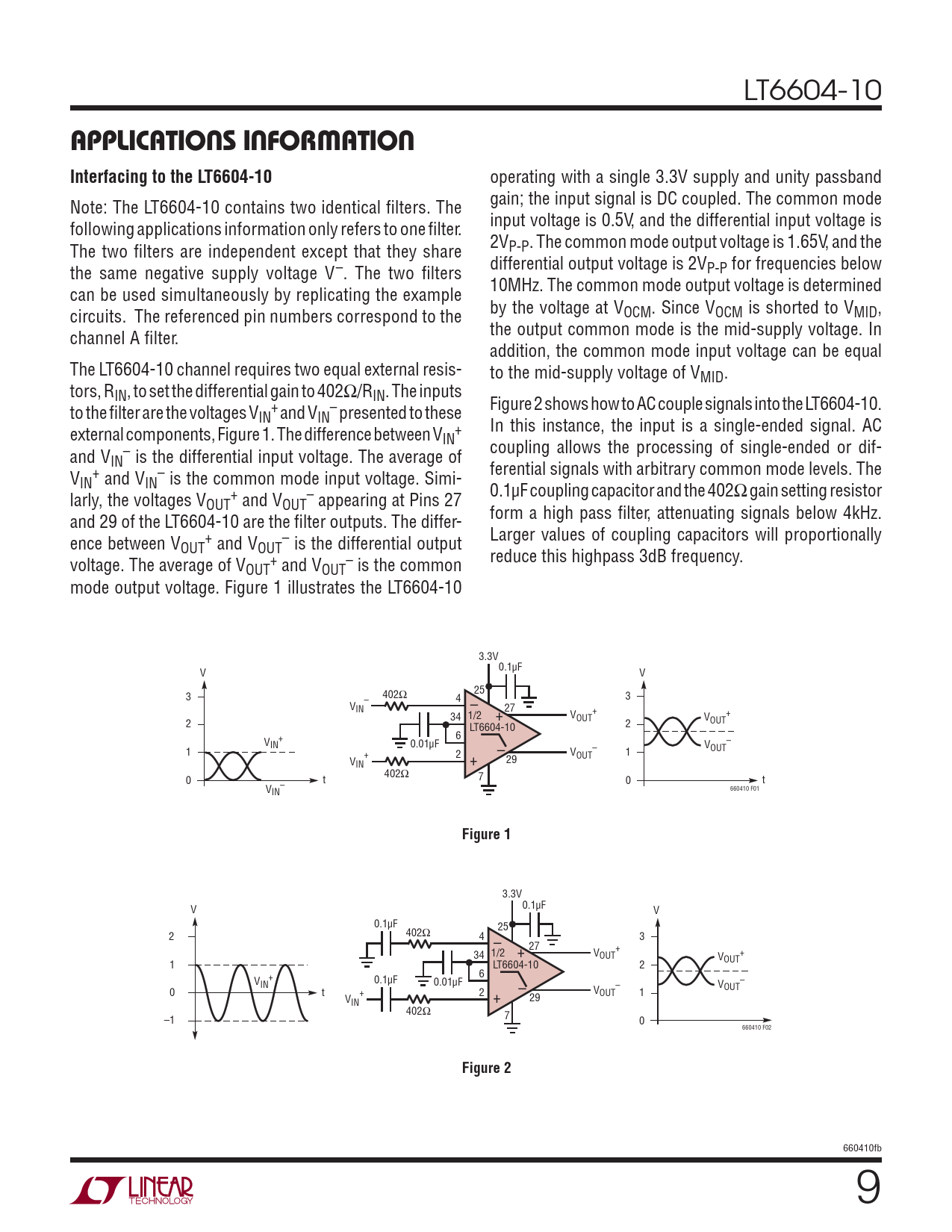 LT6604-10 APPLICATIONS INFORMATIONInterfacing to the LT6604-10 operating with a single 3.3V supply and unity passband gain; the input signal is DC coupled. The common mode Note: The LT6604-10 contains two identical fi lters. The input voltage is 0.5V, and the differential input voltage is following applications information only refers to one fi lter. 2V The two fi lters are independent except that they share P-P. The common mode output voltage is 1.65V, and the differential output voltage is 2V the same negative supply voltage V–. The two fi lters P-P for frequencies below 10MHz. The common mode output voltage is determined can be used simultaneously by replicating the example by the voltage at V circuits. The referenced pin numbers correspond to the OCM. Since VOCM is shorted to VMID, the output common mode is the mid-supply voltage. In channel A fi lter. addition, the common mode input voltage can be equal The LT6604-10 channel requires two equal external resis- to the mid-supply voltage of VMID. tors, RIN, to set the differential gain to 402Ω/RIN. The inputs Figure 2 shows how to AC couple signals into the LT6604-10. to the fi lter are the voltages V + – IN and VIN presented to these In this instance, the input is a single-ended signal. AC external components, Figure 1. The difference between V + IN coupling allows the processing of single-ended or dif- and V – IN is the differential input voltage. The average of ferential signals with arbitrary common mode levels. The V + – IN and VIN is the common mode input voltage. Simi- 0.1μF coupling capacitor and the 402Ω gain setting resistor larly, the voltages V + – OUT and VOUT appearing at Pins 27 form a high pass fi lter, attenuating signals below 4kHz. and 29 of the LT6604-10 are the fi lter outputs. The differ- Larger values of coupling capacitors will proportionally ence between V + – OUT and VOUT is the differential output reduce this highpass 3dB frequency. voltage. The average of V + – OUT and VOUT is the common mode output voltage. Figure 1 illustrates the LT6604-10 3.3V 0.1μF V V 3 402Ω 25 – 4 3 VIN – 27 + 34 1/2 + V + OUT V 2 2 OUT LT6604-10 6 V + – IN 0.01μF – V 1 OUT + 2 – VOUT 1 V 29 IN + 402Ω 7 0 t 0 t – 660410 F01 VIN Figure 1 3.3V 0.1μF V V 0.1μF 25 402Ω 2 4 – 3 + 34 1/2 + 27 VOUT V + OUT 1 LT6604-10 2 6 V + 0.1μF IN 0.01μF – – VOUT 0 t + 2 – VOUT 1 V 29 IN + 402Ω 7 –1 0 660410 F02 Figure 2 660410fb 9