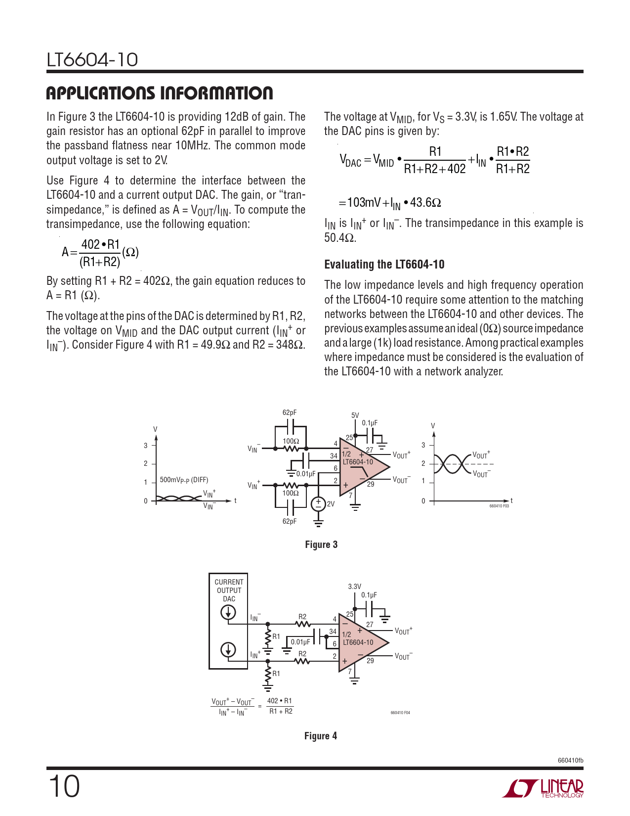 LT6604-10 APPLICATIONS INFORMATION In Figure 3 the LT6604-10 is providing 12dB of gain. The The voltage at VMID, for VS = 3.3V, is 1.65V. The voltage at gain resistor has an optional 62pF in parallel to improve the DAC pins is given by: the passband fl atness near 10MHz. The common mode R1 R1•R2 output voltage is set to 2V. VDAC = VMID • +I R1+R2+ 402 IN • R1+R2 Use Figure 4 to determine the interface between the LT6604-10 and a current output DAC. The gain, or “tran- =103mV +I simpedance,” is defi ned as A = V IN • 43.6Ω OUT/IIN. To compute the transimpedance, use the following equation: I + – IN is IIN or IIN . The transimpedance in this example is 50.4Ω. A = 402 •R1(Ω) (R1+R2) Evaluating the LT6604-10 By setting R1 + R2 = 402Ω, the gain equation reduces to The low impedance levels and high frequency operation A = R1 (Ω). of the LT6604-10 require some attention to the matching The voltage at the pins of the DAC is determined by R1, R2, networks between the LT6604-10 and other devices. The the voltage on V + previous examples assume an ideal (0Ω) source impedance MID and the DAC output current (IIN or I – and a large (1k) load resistance. Among practical examples IN ). Consider Figure 4 with R1 = 49.9Ω and R2 = 348Ω. where impedance must be considered is the evaluation of the LT6604-10 with a network analyzer. 62pF 5V 0.1μF V V 100Ω 25 – 4 3 3 VIN – + + 34 1/2 + 27 VOUT VOUT 2 LT6604-10 2 6 0.01μF – – VOUT 500mVP-P (DIFF) + 2 – VOUT 1 1 V 29 IN + V + 100Ω IN 7 0 t – + 0 t V 660410 F03 IN – 2V 62pF Figure 3 CURRENT 3.3V OUTPUT 0.1μF DAC – 25 IIN R2 4 – 27 34 + V + OUT R1 1/2 0.01μF 6 LT6604-10 I + R2 – IN 2 – + VOUT 29 7 R1 V + – OUT – VOUT 402 • R1 = I + – I – R1 + R2 660410 F04 IN IN Figure 4 660410fb 10