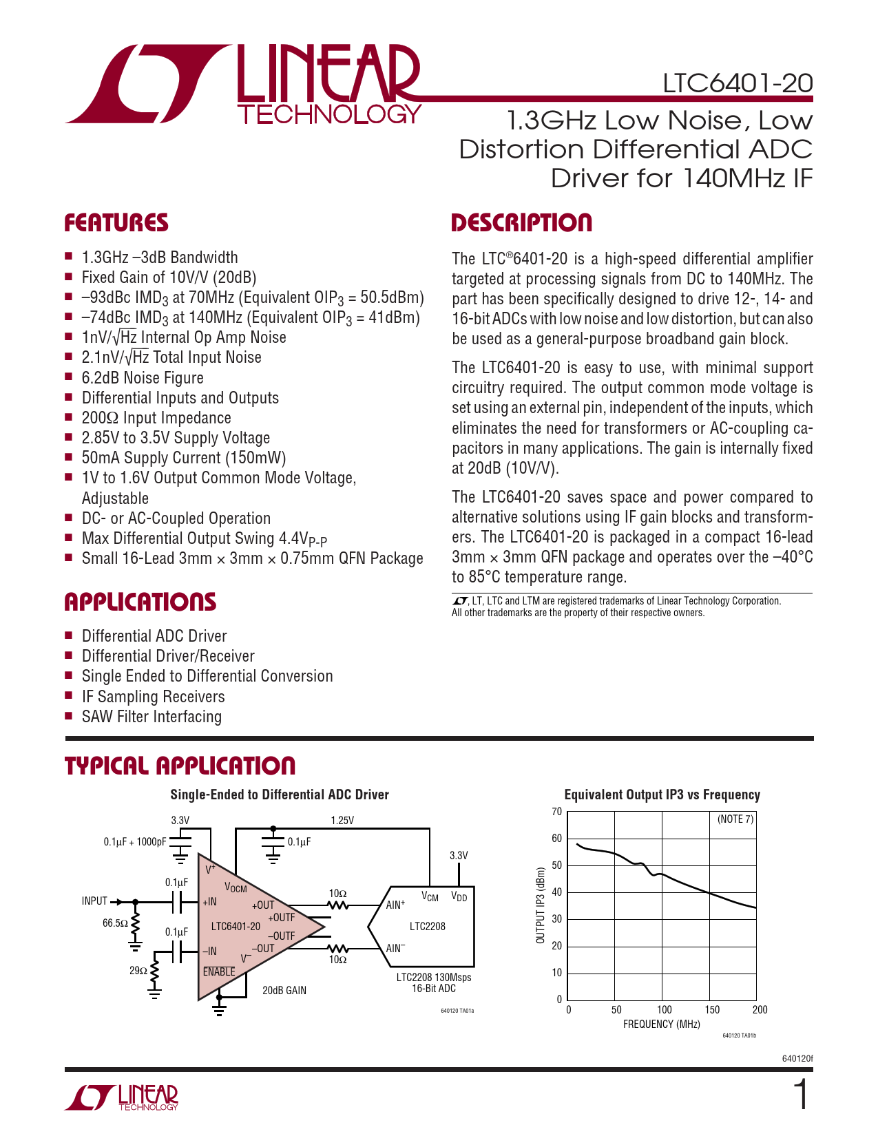 LTC6401-20 1.3GHz Low Noise, Low Distortion Differential ADC Driver for 140MHz IF FEATURESDESCRIPTION ■ 1.3GHz –3dB Bandwidth The LTC®6401-20 is a high-speed differential amplifi er ■ Fixed Gain of 10V/V (20dB) targeted at processing signals from DC to 140MHz. The ■ –93dBc IMD3 at 70MHz (Equivalent OIP3 = 50.5dBm) part has been specifi cally designed to drive 12-, 14- and ■ –74dBc IMD3 at 140MHz (Equivalent OIP3 = 41dBm) 16-bit ADCs with low noise and low distortion, but can also ■ 1nV/√⎯H⎯z Internal Op Amp Noise be used as a general-purpose broadband gain block. ■ 2.1nV/√⎯H⎯z Total Input Noise The LTC6401-20 is easy to use, with minimal support ■ 6.2dB Noise Figure circuitry required. The output common mode voltage is ■ Differential Inputs and Outputs set using an external pin, independent of the inputs, which ■ 200Ω Input Impedance eliminates the need for transformers or AC-coupling ca- ■ 2.85V to 3.5V Supply Voltage pacitors in many applications. The gain is internally fi xed ■ 50mA Supply Current (150mW) at 20dB (10V/V). ■ 1V to 1.6V Output Common Mode Voltage, Adjustable The LTC6401-20 saves space and power compared to ■ DC- or AC-Coupled Operation alternative solutions using IF gain blocks and transform- ■ Max Differential Output Swing 4.4V ers. The LTC6401-20 is packaged in a compact 16-lead P-P ■ Small 16-Lead 3mm × 3mm × 0.75mm QFN Package 3mm × 3mm QFN package and operates over the –40°C to 85°C temperature range. APPLICATIONS , LT, LTC and LTM are registered trademarks of Linear Technology Corporation. All other trademarks are the property of their respective owners. ■ Differential ADC Driver ■ Differential Driver/Receiver ■ Single Ended to Differential Conversion ■ IF Sampling Receivers ■ SAW Filter Interfacing TYPICAL APPLICATIONSingle-Ended to Differential ADC DriverEquivalent Output IP3 vs Frequency 70 3.3V 1.25V (NOTE 7) 0.1μF + 1000pF 0.1μF 60 3.3V V+ 50 0.1μF VOCM 10Ω V 40 INPUT CM VDD +IN +OUT AIN+ +OUTF 66.5Ω 30 LTC6401-20 LTC2208 0.1μF –OUTF OUTPUT IP3 (dBm) –OUT AIN– 20 –IN V– 10Ω 29Ω ENABLE LTC2208 130Msps 10 20dB GAIN 16-Bit ADC 0 640120 TA01a 0 50 100 150 200 FREQUENCY (MHz) 640120 TA01b 640120f 1