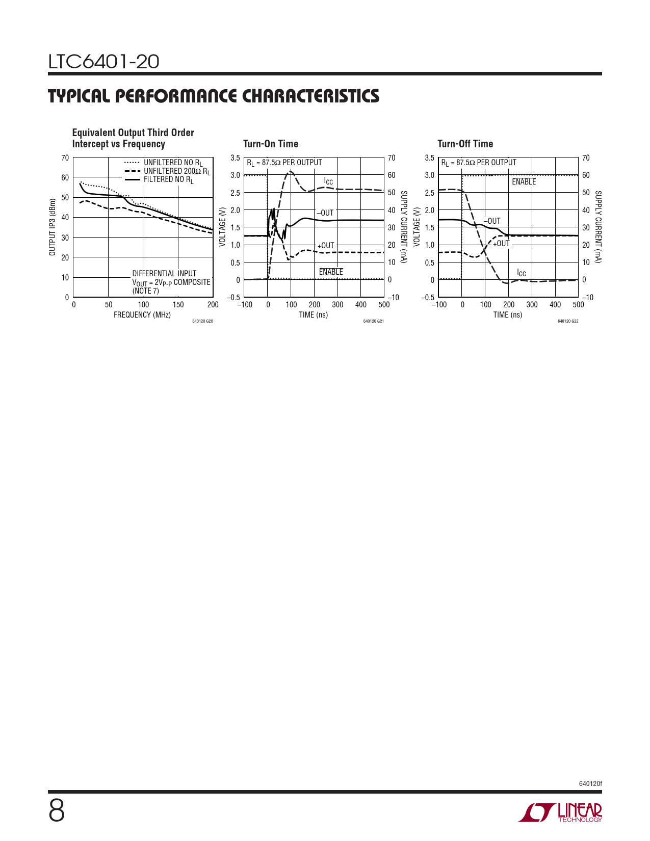70 3.5 70 3.5 70 UNFILTERED NO R R R L L = 87.5Ω PER OUTPUT L = 87.5Ω PER OUTPUT UNFILTERED 200Ω RL 3.0 60 3.0 60 60 FILTERED NO RL ICC ENABLE SUPPLY CURRENT (mA) SUPPLY CURRENT (mA) 2.5 50 2.5 50 50 2.0 40 2.0 40 –OUT 40 –OUT 1.5 30 1.5 30 30 VOLTAGE (V) 1.0 +OUT 20 VOLTAGE (V) 1.0 +OUT 20 OUTPUT IP3 (dBm) 20 0.5 10 0.5 10 ENABLE I DIFFERENTIAL INPUT CC 10 0 0 0 0 VOUT = 2VP-P COMPOSITE (NOTE 7) 0 –0.5 –10 –0.5 –10 0 50 100 150 200 –100 0 100 200 300 400 500 –100 0 100 200 300 400 500 FREQUENCY (MHz) TIME (ns) TIME (ns) 640120 G20 640120 G21 640120 G22 640120f 8