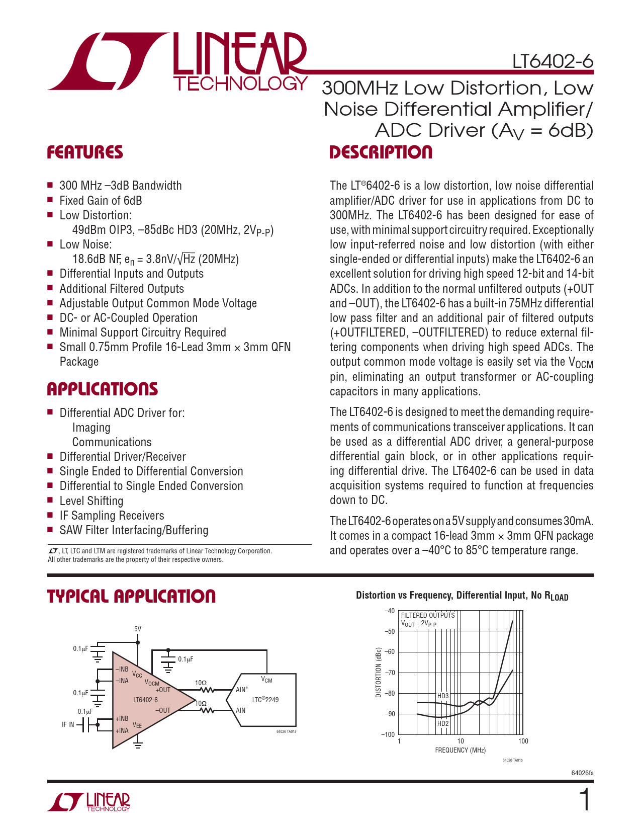 LT6402-6 300MHz Low Distortion, Low Noise Differential Amplifi er/ ADC Driver (AV = 6dB)