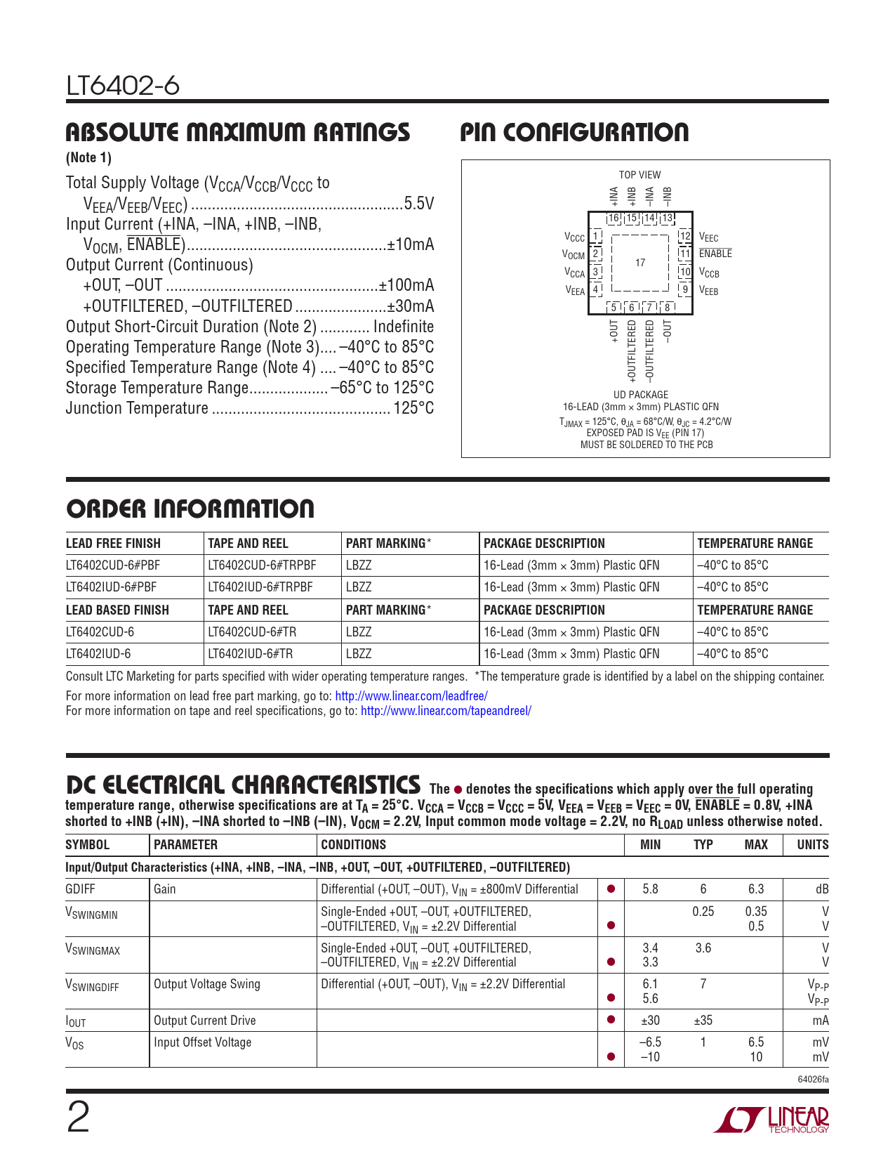 LT6402CUD-6#PBF LT6402CUD-6#TRPBF LBZZ 16-Lead (3mm × 3mm) Plastic QFN –40°C to 85°C LT6402IUD-6#PBF LT6402IUD-6#TRPBF LBZZ 16-Lead (3mm × 3mm) Plastic QFN –40°C to 85°C