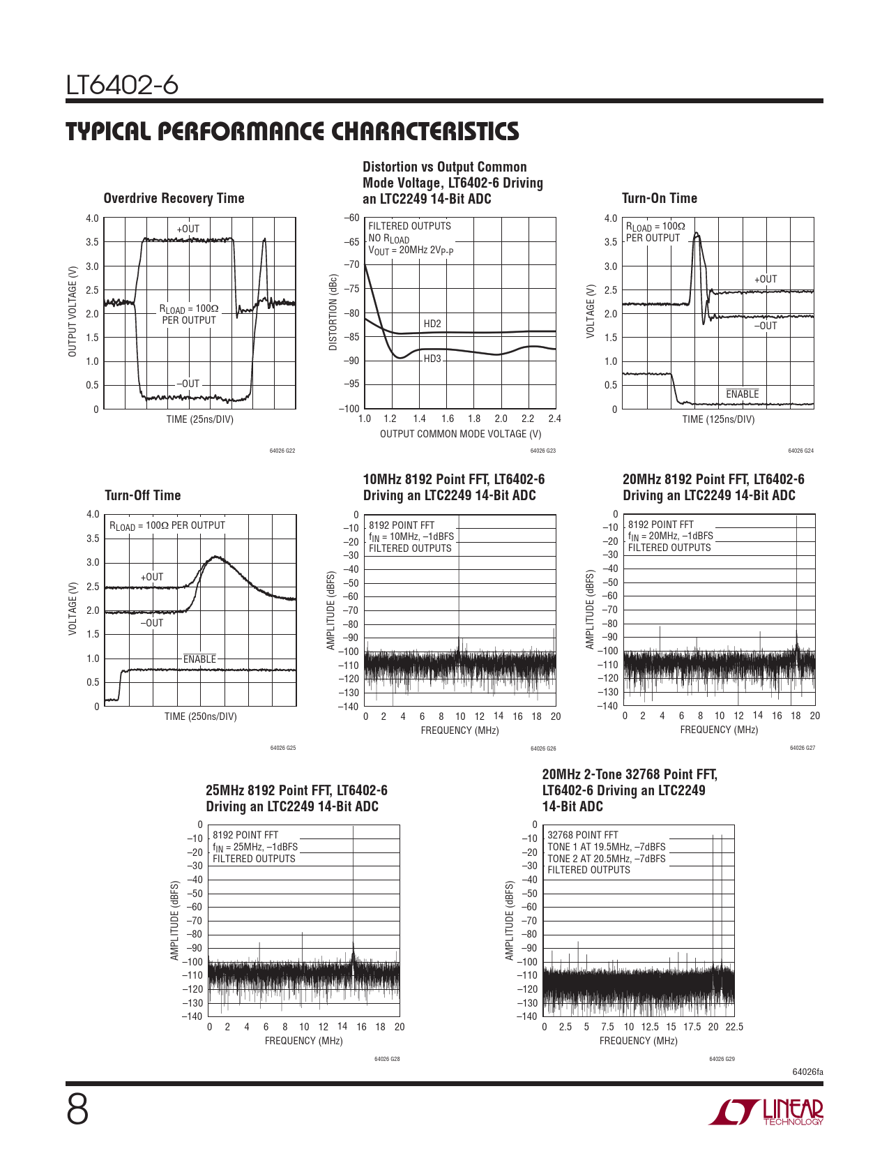 10MHz 8192 Point FFT, LT6402-6 20MHz 8192 Point FFT, LT6402-6 Turn-Off Time Driving an LTC2249 14-Bit ADC Driving an LTC2249 14-Bit ADC