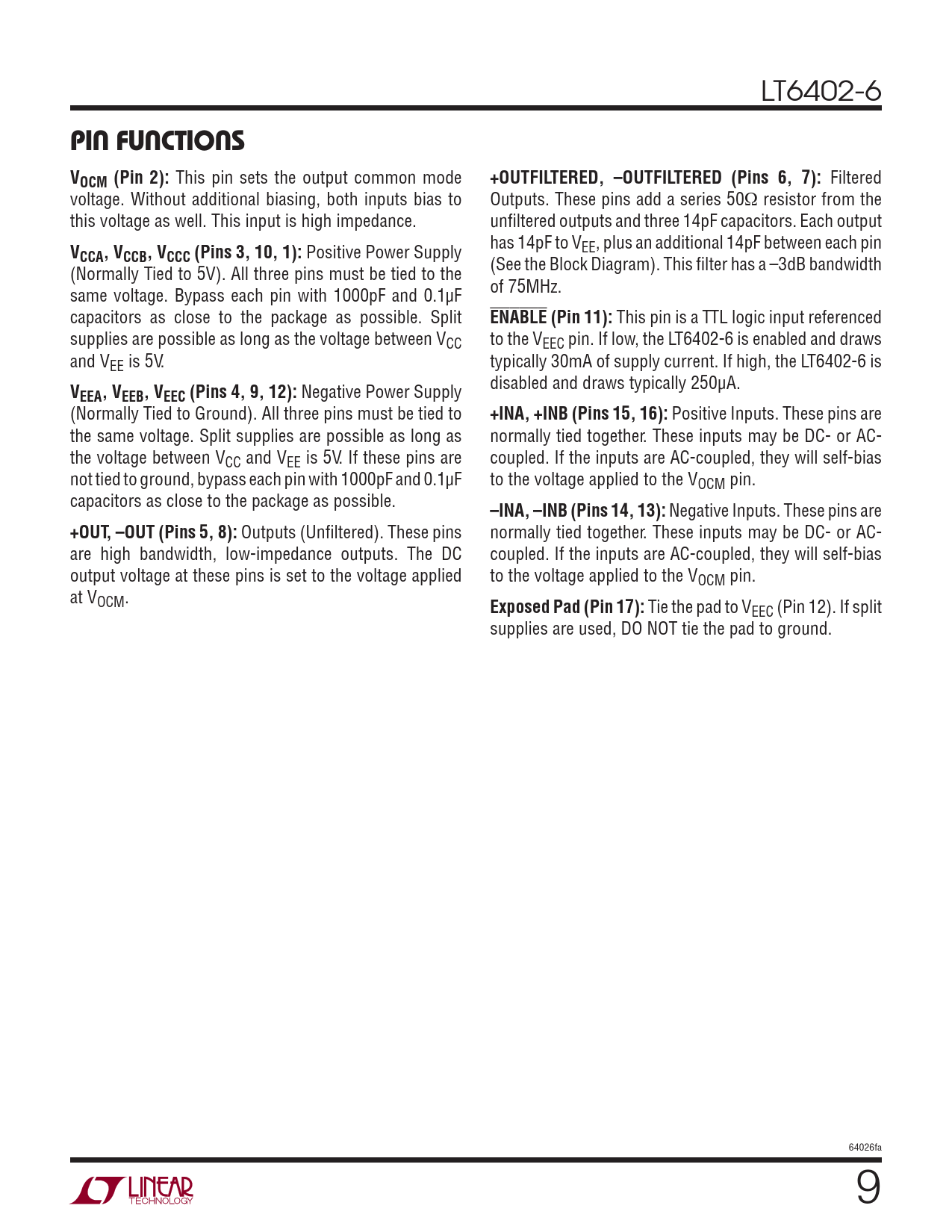 PIN FUNCTIONS. VOCM (Pin 2):. +OUTFILTERED, –OUTFILTERED (Pins 6, 7):. CCA, VCCB, VCCC (Pins 3, 10, 1):. ENABLE (Pin 11):