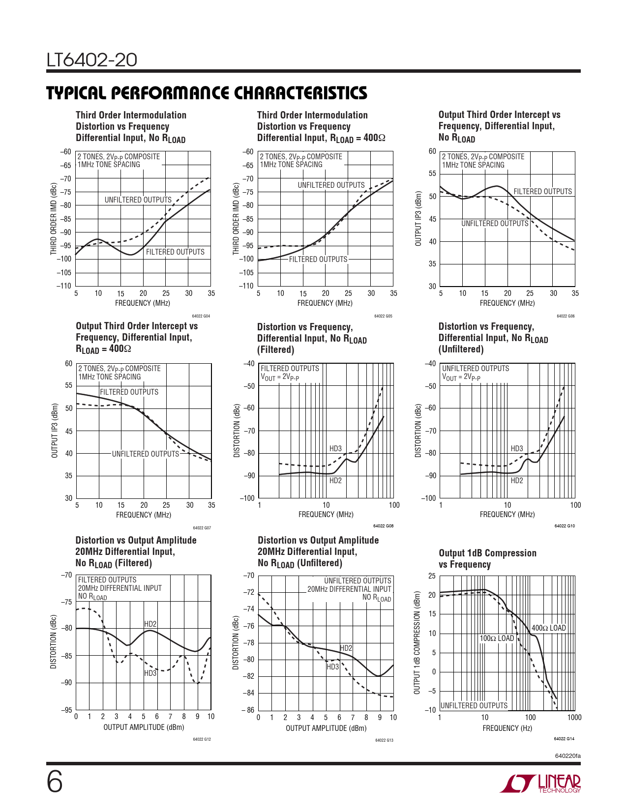 –70 –70 25 FILTERED OUTPUTS UNFILTERED OUTPUTS 20MHz DIFFERENTIAL INPUT –72 20MHz DIFFERENTIAL INPUT NO R 20 LOAD NO R –75 LOAD –74 15 HD2 –80 –76 400Ω LOAD 10 100Ω LOAD –78 HD2 5 –85 –80 DISTORTION (dBc) DISTORTION (dBc) HD3 HD3 0 –82 –90 –84 OUTPUT 1dB COMPRESSION (dBm) –5 UNFILTERED OUTPUTS –95 – 86 –10 0 1 2 3 4 5 6 7 8 9 10 0 1 2 3 4 5 6 7 8 9 10 1 10 100 1000 OUTPUT AMPLITUDE (dBm) OUTPUT AMPLITUDE (dBm) FREQUENCY (Hz) 64022 G12 64022 G13 64022 G14 640220fa 6