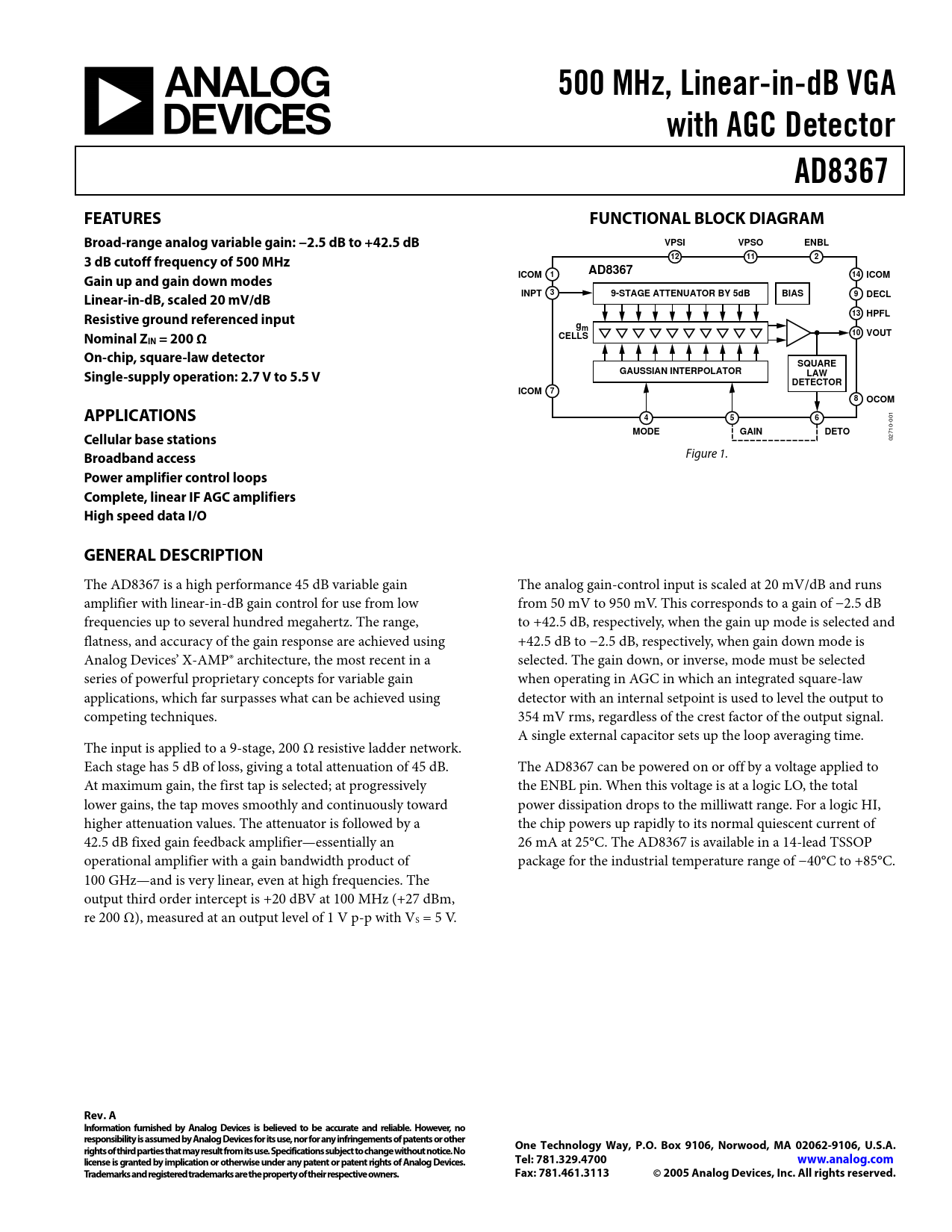500 MHz, Linear-in-dB VGA. with AGC Detector. AD8367. FEATURES. FUNCTIONAL BLOCK DIAGRAM