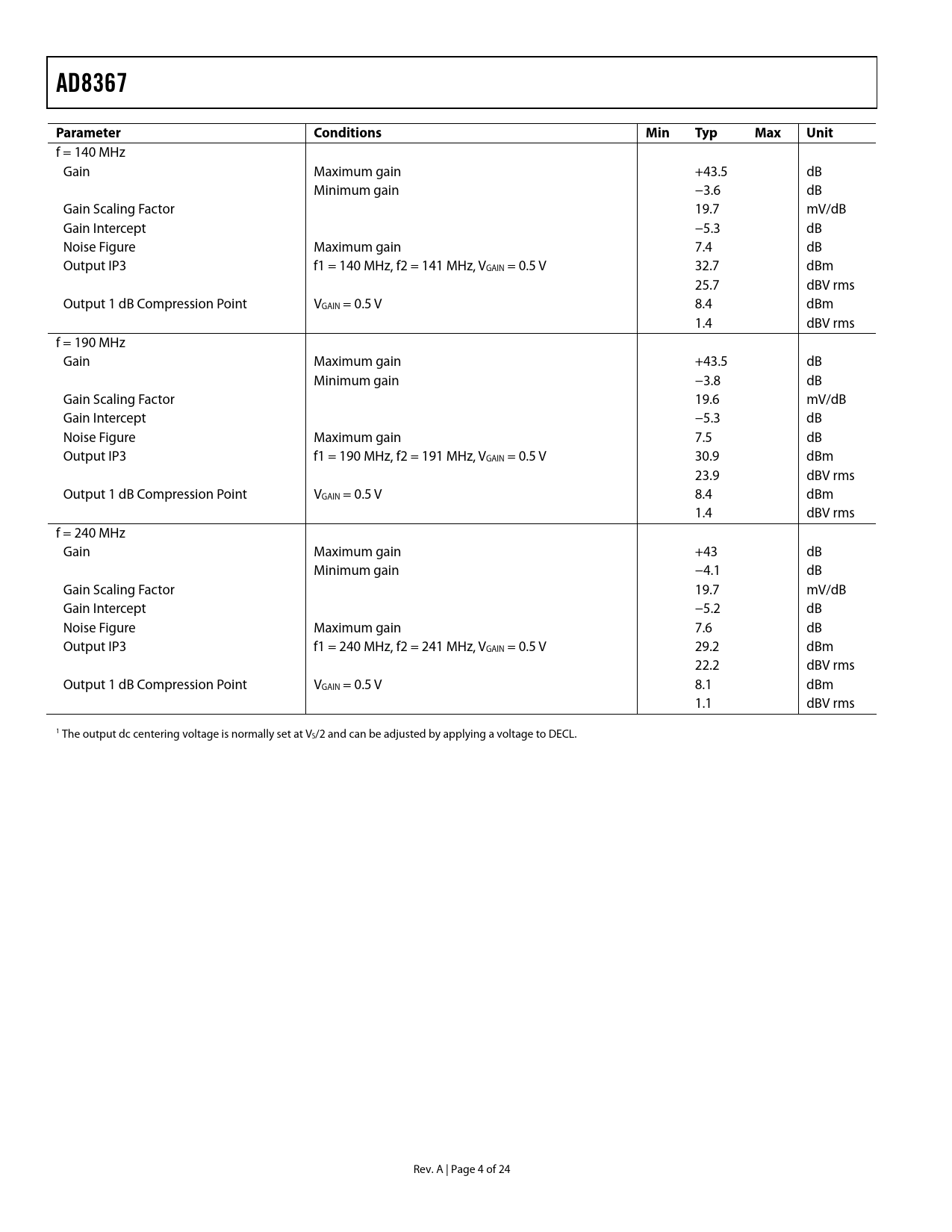 AD8367Parameter ConditionsMinTypMaxUnit f = 140 MHz Gain Maximum gain +43.5 dB Minimum gain −3.6 dB Gain Scaling Factor 19.7 mV/dB Gain Intercept −5.3 dB Noise Figure Maximum gain 7.4 dB Output IP3 f1 = 140 MHz, f2 = 141 MHz, VGAIN = 0.5 V 32.7 dBm 25.7 dBV rms Output 1 dB Compression Point VGAIN = 0.5 V 8.4 dBm 1.4 dBV rms f = 190 MHz Gain Maximum gain +43.5 dB Minimum gain −3.8 dB Gain Scaling Factor 19.6 mV/dB Gain Intercept −5.3 dB Noise Figure Maximum gain 7.5 dB Output IP3 f1 = 190 MHz, f2 = 191 MHz, VGAIN = 0.5 V 30.9 dBm 23.9 dBV rms Output 1 dB Compression Point VGAIN = 0.5 V 8.4 dBm 1.4 dBV rms f = 240 MHz Gain Maximum gain +43 dB Minimum gain −4.1 dB Gain Scaling Factor 19.7 mV/dB Gain Intercept −5.2 dB Noise Figure Maximum gain 7.6 dB Output IP3 f1 = 240 MHz, f2 = 241 MHz, VGAIN = 0.5 V 29.2 dBm 22.2 dBV rms Output 1 dB Compression Point VGAIN = 0.5 V 8.1 dBm 1.1 dBV rms 1 The output dc centering voltage is normally set at VS/2 and can be adjusted by applying a voltage to DECL. Rev. A | Page 4 of 24 Document Outline FEATURES APPLICATIONS FUNCTIONAL BLOCK DIAGRAM GENERAL DESCRIPTION TABLE OF CONTENTS REVISION HISTORY SPECIFICATIONS ABSOLUTE MAXIMUM RATINGS ESD CAUTION PIN CONFIGURATION AND FUNCTION DESCRIPTIONS TYPICAL PERFORMANCE CHARACTERISTICS THEORY OF OPERATION INPUT ATTENUATOR AND GAIN CONTROL INPUT AND OUTPUT INTERFACES POWER AND VOLTAGE METRICS NOISE AND DISTORTION OUTPUT CENTERING RMS DETECTION APPLICATIONS INPUT AND OUTPUT MATCHING VGA OPERATION MODULATED GAIN MODE AGC OPERATION MODIFYING THE AGC SETPOINT EVALUATION BOARD CHARACTERIZATION SETUP AND METHODS OUTLINE DIMENSIONS ORDERING GUIDE