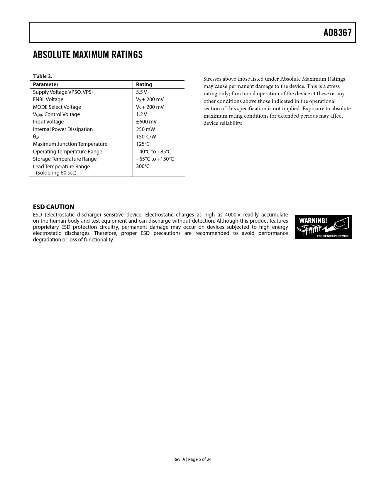 Seiten / Seite24 / 5 — AD8367. ABSOLUTE MAXIMUM RATINGS. Table 2. Parameter Rating. ESD CAUTION