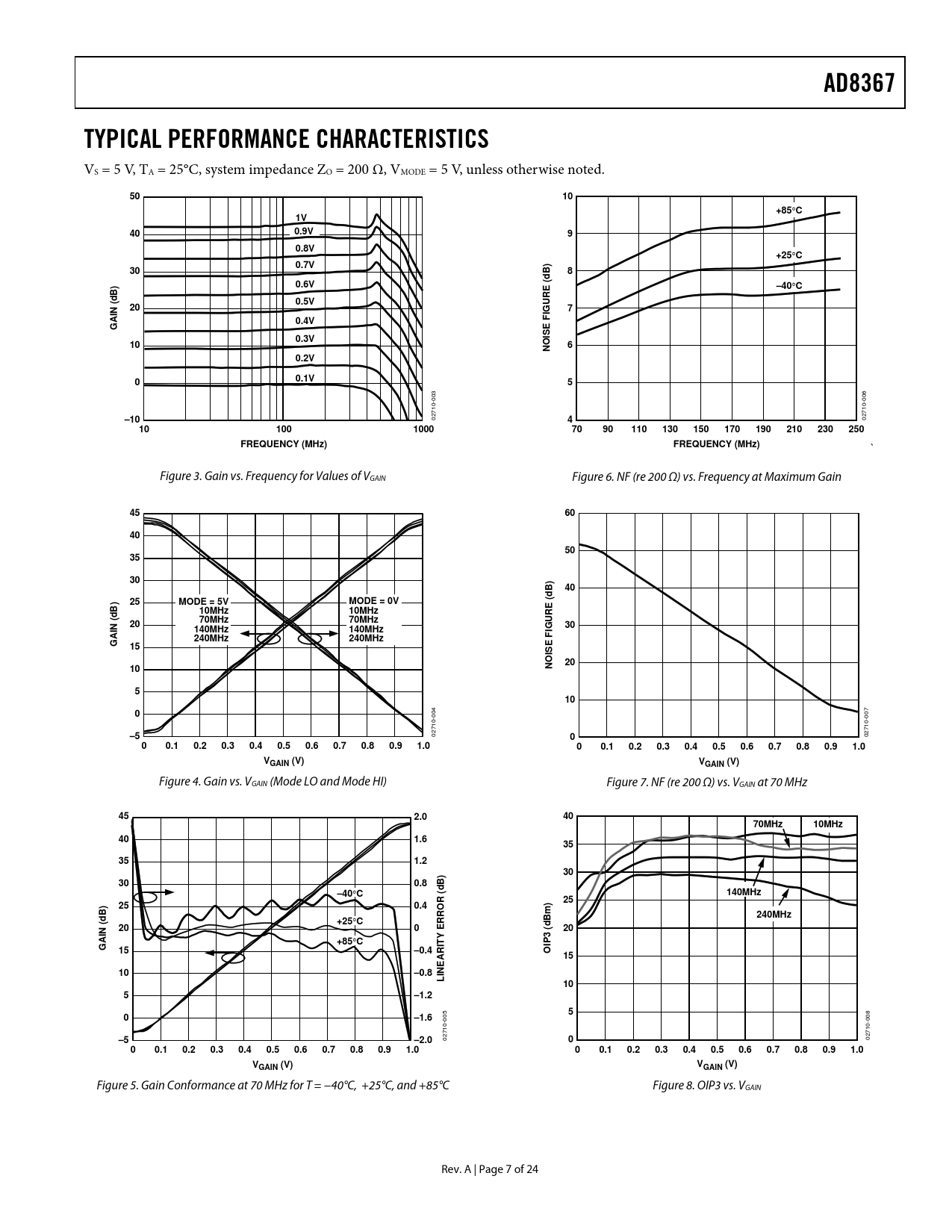 AD8367. TYPICAL PERFORMANCE CHARACTERISTICS. +85. 0.9V. 0.8V. +25. 0.7V. 0.6V. (dB). –40. B) d. 0.5V. 0.4V. FIGURE. GAIN (. 0.3V. NOIS. 0.2V. 0.1V. –10. 100