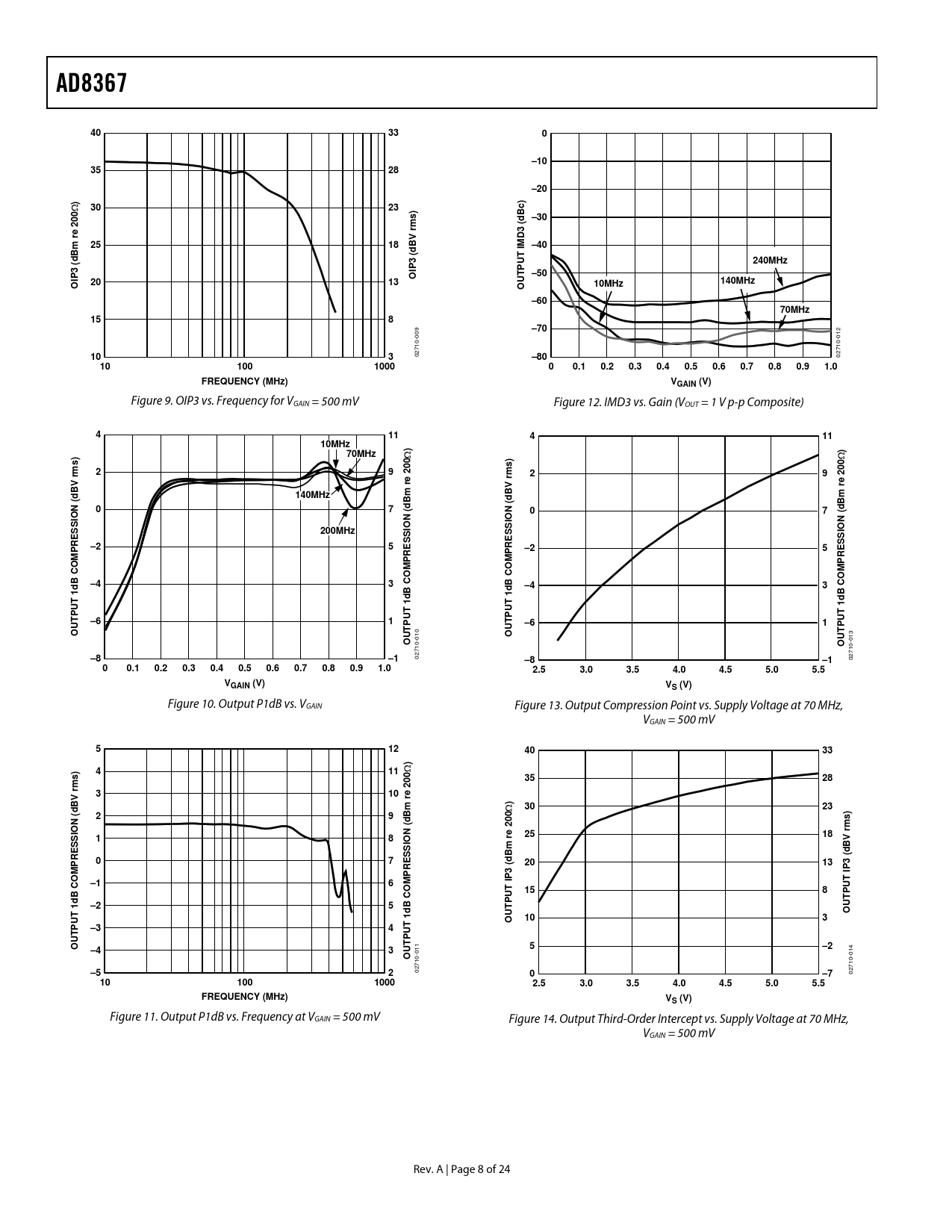 AD836740330–103528–20)) Ω 3023–30(dBc2518BV rms)–40Bm re 200ddUT IMD3240MHzOIP3 (–502013140MHzOIP3 (OUTP10MHz–6070MHz158–70103 02710-009 –80 02710-012 10100100000.10.20.30.40.50.60.70.80.91.0FREQUENCY (MHz)VGAIN (V) Figure 9. OIP3 vs. Frequency for VGAIN = 500 mV Figure 12. IMD3 vs. Gain (VOUT = 1 V p-p Composite) 41141110MHz))70MHz Ω Ω 29rms)29rms)Vre 200VBre 200Bdm140MHzdm(B(B07dd(07(200MHzESSIONESSIONR–25RPESSION–25ESSIONRPRPOMPOMCOMCOM–43C–43C1dB1dBT1dBT1dBTTTPU–61TPU–61TPUOUTPUOUOUOU–8–1 02710-010 –8–1 02710-013 00.10.20.30.40.50.60.70.80.91.02.53.03.54.04.55.05.5VGAIN (V)VS (V) Figure 10. Output P1dB vs. VGAIN Figure 13. Output Compression Point vs. Supply Voltage at 70 MHz, VGAIN = 500 mV 5124033)411 Ω 3528rms)310Vre 200B)dm3023 Ω )(29B d (rms125188ESSIONBm re 200R(dBV07dPESSION20133R POM–16CUT IPOM158C–251dB TOUTP1dBOUTPUT IP3 (103–34TTPUTPUOU–435–2OU–52 02710-011 0–7 02710-014 1010010002.53.03.54.04.55.05.5FREQUENCY (MHz)VS (V) Figure 11. Output P1dB vs. Frequency at VGAIN = 500 mV Figure 14. Output Third-Order Intercept vs. Supply Voltage at 70 MHz, VGAIN = 500 mV Rev. A | Page 8 of 24 Document Outline FEATURES APPLICATIONS FUNCTIONAL BLOCK DIAGRAM GENERAL DESCRIPTION TABLE OF CONTENTS REVISION HISTORY SPECIFICATIONS ABSOLUTE MAXIMUM RATINGS ESD CAUTION PIN CONFIGURATION AND FUNCTION DESCRIPTIONS TYPICAL PERFORMANCE CHARACTERISTICS THEORY OF OPERATION INPUT ATTENUATOR AND GAIN CONTROL INPUT AND OUTPUT INTERFACES POWER AND VOLTAGE METRICS NOISE AND DISTORTION OUTPUT CENTERING RMS DETECTION APPLICATIONS INPUT AND OUTPUT MATCHING VGA OPERATION MODULATED GAIN MODE AGC OPERATION MODIFYING THE AGC SETPOINT EVALUATION BOARD CHARACTERIZATION SETUP AND METHODS OUTLINE DIMENSIONS ORDERING GUIDE