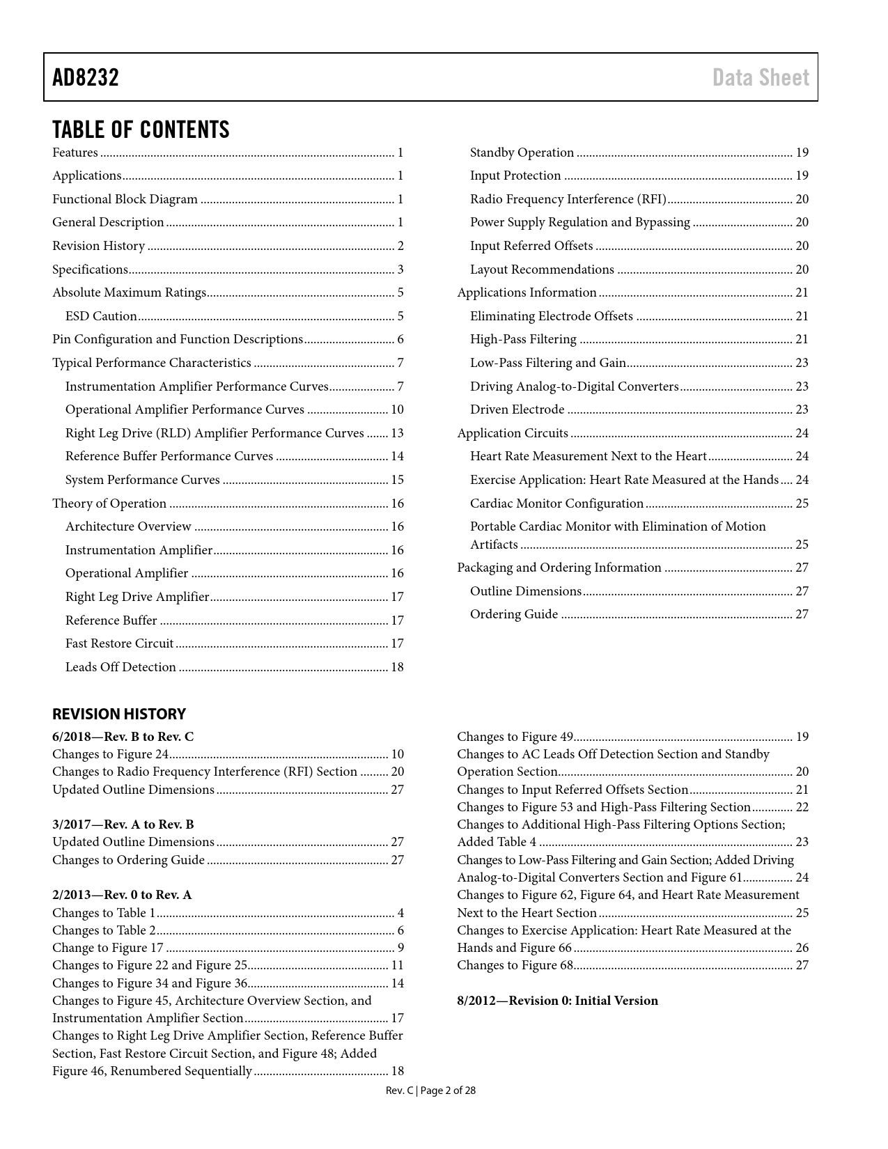 AD8232 Data Sheet TABLE OF CONTENTS REVISION HISTORY 6/2018—Rev B to Rev C 3/2017—Rev A to Rev B 2/2013—Rev 0 to Rev A