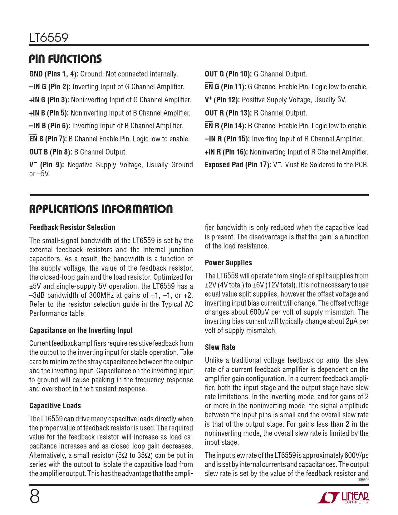 LT6559 PIN FUNCTIONSGND (Pins 1, 4): Ground. Not connected internally. OUT G (Pin 10): G Channel Output. –IN G (Pin 2): Inverting Input of G Channel Amplifi er. ⎯ E ⎯ N G (Pin 11): G Channel Enable Pin. Logic low to enable. +IN G (Pin 3): Noninverting Input of G Channel Amplifi er. V+ (Pin 12): Positive Supply Voltage, Usually 5V. +IN B (Pin 5): Noninverting Input of B Channel Amplifi er. OUT R (Pin 13): R Channel Output. –IN B (Pin 6): Inverting Input of B Channel Amplifi er. ⎯ E ⎯ N R (Pin 14): R Channel Enable Pin. Logic low to enable. ⎯ E ⎯ N B (Pin 7): B Channel Enable Pin. Logic low to enable. –IN R (Pin 15): Inverting Input of R Channel Amplifi er. OUT B (Pin 8): B Channel Output. +IN R (Pin 16): Noninverting Input of R Channel Amplifi er. V– (Pin 9): Negative Supply Voltage, Usually Ground Exposed Pad (Pin 17): V–. Must Be Soldered to the PCB. or –5V. APPLICATIONS INFORMATIONFeedback Resistor Selection fi er bandwidth is only reduced when the capacitive load is present. The disadvantage is that the gain is a function The small-signal bandwidth of the LT6559 is set by the of the load resistance. external feedback resistors and the internal junction capacitors. As a result, the bandwidth is a function of Power Supplies the supply voltage, the value of the feedback resistor, the closed-loop gain and the load resistor. Optimized for The LT6559 will operate from single or split supplies from ±5V and single-supply 5V operation, the LT6559 has a ±2V (4V total) to ±6V (12V total). It is not necessary to use –3dB bandwidth of 300MHz at gains of +1, –1, or +2. equal value split supplies, however the offset voltage and Refer to the resistor selection guide in the Typical AC inverting input bias current will change. The offset voltage Performance table. changes about 600µV per volt of supply mismatch. The inverting bias current will typically change about 2µA per Capacitance on the Inverting Input volt of supply mismatch. Current feedback amplifi ers require resistive feedback from Slew Rate the output to the inverting input for stable operation. Take care to minimize the stray capacitance between the output Unlike a traditional voltage feedback op amp, the slew and the inverting input. Capacitance on the inverting input rate of a current feedback amplifi er is dependent on the to ground will cause peaking in the frequency response amplifi er gain confi guration. In a current feedback ampli- and overshoot in the transient response. fi er, both the input stage and the output stage have slew rate limitations. In the inverting mode, and for gains of 2 Capacitive Loads or more in the noninverting mode, the signal amplitude between the input pins is small and the overall slew rate The LT6559 can drive many capacitive loads directly when is that of the output stage. For gains less than 2 in the the proper value of feedback resistor is used. The required noninverting mode, the overall slew rate is limited by the value for the feedback resistor will increase as load ca- input stage. pacitance increases and as closed-loop gain decreases. Alternatively, a small resistor (5Ω to 35Ω) can be put in The input slew rate of the LT6559 is approximately 600V/µs series with the output to isolate the capacitive load from and is set by internal currents and capacitances. The output the amplifi er output. This has the advantage that the ampli- slew rate is set by the value of the feedback resistor and 6559f 8