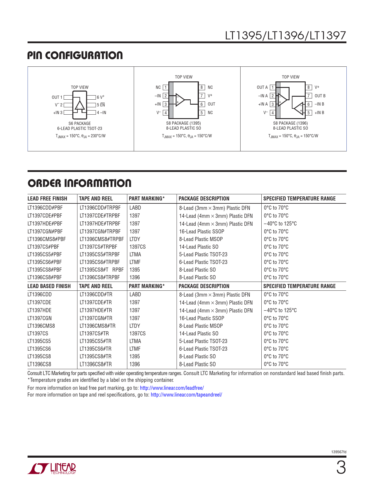 LT1395/LT1396/LT1397 PIN CONFIGURATION TOP VIEW TOP VIEW TOP VIEW NC 1 8 NC OUT A 1 8 V+ OUT 1 6 V+ –IN 2 7 V+ – –IN A 2 7 OUT B – + + V– 2 5 EN +IN 3 6 OUT +IN A 3 6 –IN B – + – + +IN 3 4 –IN V– 4 5 NC V– 4 5 +IN B S6 PACKAGE S8 PACKAGE (1395) S8 PACKAGE (1396) 6-LEAD PLASTIC TSOT-23 8-LEAD PLASTIC SO 8-LEAD PLASTIC SO TJMAX = 150°C, θJA = 230°C/W TJMAX = 150°C, θJA = 150°C/W TJMAX = 150°C, θJA = 150°C/W ORDER INFORMATIONLEAD FREE FINISHTAPE AND REELPART MARKING*PACKAGE DESCRIPTIONSPECIFIED TEMPERATURE RANGE LT1396CDD#PBF LT1396CDD#TRPBF LABD 8-Lead (3mm × 3mm) Plastic DFN 0°C to 70°C LT1397CDE#PBF LT1397CDE#TRPBF 1397 14-Lead (4mm × 3mm) Plastic DFN 0°C to 70°C LT1397HDE#PBF LT1397HDE#TRPBF 1397 14-Lead (4mm × 3mm) Plastic DFN –40°C to 125°C LT1397CGN#PBF LT1397CGN#TRPBF 1397 16-Lead Plastic SSOP 0°C to 70°C LT1396CMS8#PBF LT1396CMS8#TRPBF LTDY 8-Lead Plastic MSOP 0°C to 70°C LT1397CS#PBF LT1397CS#TRPBF 1397CS 14-Lead Plastic SO 0°C to 70°C LT1395CS5#PBF LT1395CS5#TRPBF LTMA 5-Lead Plastic TSOT-23 0°C to 70°C LT1395CS6#PBF LT1395CS6#TRPBF LTMF 6-Lead Plastic TSOT-23 0°C to 70°C LT1395CS8#PBF LT1395CS8#T RPBF 1395 8-Lead Plastic SO 0°C to 70°C LT1396CS8#PBF LT1396CS8#TRPBF 1396 8-Lead Plastic SO 0°C to 70°C LEAD BASED FINISHTAPE AND REELPART MARKING*PACKAGE DESCRIPTIONSPECIFIED TEMPERATURE RANGE LT1396CDD LT1396CDD#TR LABD 8-Lead (3mm × 3mm) Plastic DFN 0°C to 70°C LT1397CDE LT1397CDE#TR 1397 14-Lead (4mm × 3mm) Plastic DFN 0°C to 70°C LT1397HDE LT1397HDE#TR 1397 14-Lead (4mm × 3mm) Plastic DFN –40°C to 125°C LT1397CGN LT1397CGN#TR 1397 16-Lead Plastic SSOP 0°C to 70°C LT1396CMS8 LT1396CMS8#TR LTDY 8-Lead Plastic MSOP 0°C to 70°C LT1397CS LT1397CS#TR 1397CS 14-Lead Plastic SO 0°C to 70°C LT1395CS5 LT1395CS5#TR LTMA 5-Lead Plastic TSOT-23 0°C to 70°C LT1395CS6 LT1395CS6#TR LTMF 6-Lead Plastic TSOT-23 0°C to 70°C LT1395CS8 LT1395CS8#TR 1395 8-Lead Plastic SO 0°C to 70°C LT1396CS8 LT1396CS8#TR 1396 8-Lead Plastic SO 0°C to 70°C Consult LTC Marketing for parts specifi ed with wider operating temperature ranges. Consult LTC Marketing for information on nonstandard lead based fi nish parts. *Temperature grades are identifi ed by a label on the shipping container. For more information on lead free part marking, go to: http://www.linear.com/leadfree/ For more information on tape and reel specifi cations, go to: http://www.linear.com/tapeandreel/ 139567fd 3