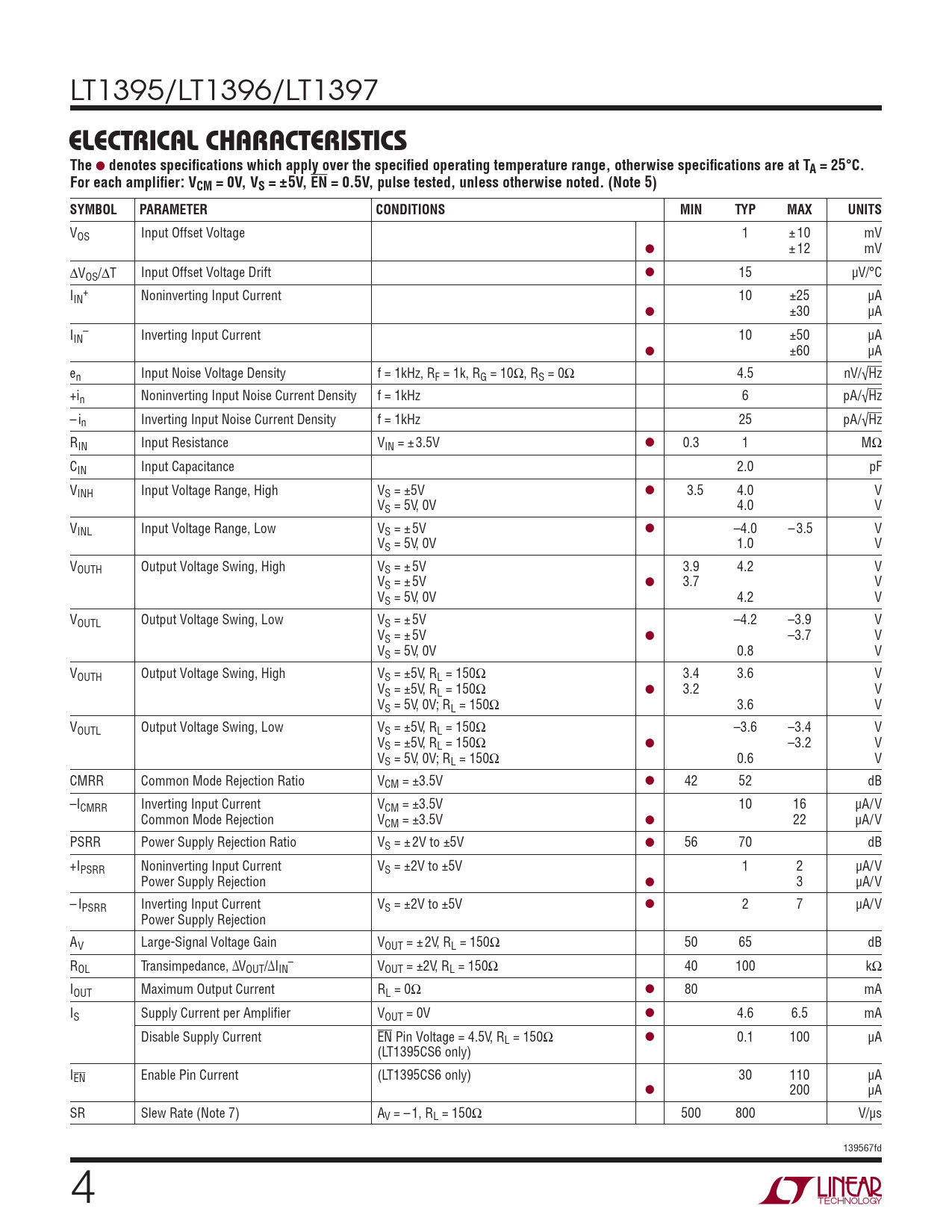 LT1395/LT1396/LT1397 ELECTRICAL CHARACTERISTICSThe ● denotes specifi cations which apply over the specifi ed operating temperature range, otherwise specifi cations are at TA = 25°C.For each amplifi er: VCM = 0V, VS = ±5V, EN = 0.5V, pulse tested, unless otherwise noted. (Note 5)SYMBOLPARAMETERCONDITIONSMINTYPMAXUNITS VOS Input Offset Voltage 1 ± 10 mV ● ± 12 mV ΔVOS/ΔT Input Offset Voltage Drift ● 15 μV/°C I + IN Noninverting Input Current 10 ±25 μA ● ±30 μA I – IN Inverting Input Current 10 ±50 μA ● ±60 μA en Input Noise Voltage Density f = 1kHz, RF = 1k, RG = 10Ω, RS = 0Ω 4.5 nV/√Hz +in Noninverting Input Noise Current Density f = 1kHz 6 pA/√Hz – in Inverting Input Noise Current Density f = 1kHz 25 pA/√Hz RIN Input Resistance VIN = ± 3.5V ● 0.3 1 MΩ CIN Input Capacitance 2.0 pF VINH Input Voltage Range, High VS = ±5V ● 3.5 4.0 V VS = 5V, 0V 4.0 V VINL Input Voltage Range, Low VS = ± 5V ● –4.0 – 3.5 V VS = 5V, 0V 1.0 V VOUTH Output Voltage Swing, High VS = ± 5V 3.9 4.2 V VS = ± 5V ● 3.7 V VS = 5V, 0V 4.2 V VOUTL Output Voltage Swing, Low VS = ± 5V –4.2 –3.9 V VS = ± 5V ● –3.7 V VS = 5V, 0V 0.8 V VOUTH Output Voltage Swing, High VS = ±5V, RL = 150Ω 3.4 3.6 V VS = ±5V, RL = 150Ω ● 3.2 V VS = 5V, 0V; RL = 150Ω 3.6 V VOUTL Output Voltage Swing, Low VS = ±5V, RL = 150Ω –3.6 –3.4 V VS = ±5V, RL = 150Ω ● –3.2 V VS = 5V, 0V; RL = 150Ω 0.6 V CMRR Common Mode Rejection Ratio VCM = ±3.5V ● 42 52 dB –ICMRR Inverting Input Current VCM = ±3.5V 10 16 μA/V Common Mode Rejection VCM = ±3.5V ● 22 μA/V PSRR Power Supply Rejection Ratio VS = ± 2V to ±5V ● 56 70 dB +IPSRR Noninverting Input Current VS = ±2V to ±5V 1 2 μA/V Power Supply Rejection ● 3 μA/V – IPSRR Inverting Input Current VS = ±2V to ±5V ● 2 7 μA/V Power Supply Rejection AV Large-Signal Voltage Gain VOUT = ± 2V, RL = 150Ω 50 65 dB R – OL Transimpedance, ΔVOUT/ΔIIN VOUT = ±2V, RL = 150Ω 40 100 kΩ IOUT Maximum Output Current RL = 0Ω ● 80 mA IS Supply Current per Amplifi er VOUT = 0V ● 4.6 6.5 mA Disable Supply Current EN Pin Voltage = 4.5V, RL = 150Ω ● 0.1 100 μA (LT1395CS6 only) IEN Enable Pin Current (LT1395CS6 only) 30 110 μA ● 200 μA SR Slew Rate (Note 7) AV = – 1, RL = 150Ω 500 800 V/μs 139567fd 4