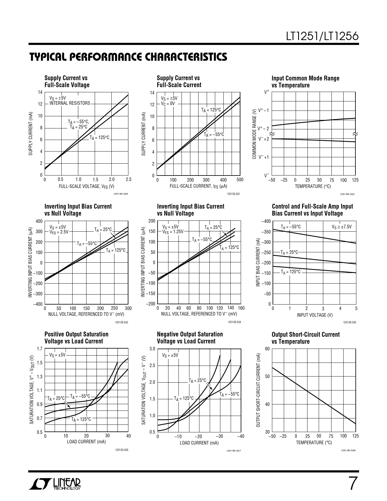 14 14 V+ VS = ±5V VS = ±5V 12 INTERNAL RESISTORS 12 VC = 0V TA = 125°C V+ – 1 10 10 TA = – 55°C, 8 TA = 25°C 8 V+ – 2 T T A = – 55°C 6 A = 125°C 6 V– + 2 4 SUPPLY CURRENT (mA) 4 SUPPLY CURRENT (mA) COMMON MODE RANGE (V) V– +1 2 2 0 0 V– 0 0.5 1.0 1.5 2.0 2.5 0 100 200 300 400 500 –50 –25 0 25 50 75 100 125 FULL-SCALE VOLTAGE, VFS (V) FULL-SCALE CURRENT, IFS (µA) TEMPERATURE (°C) 1251/56 G20 1251/56 G21 1251/56 G22