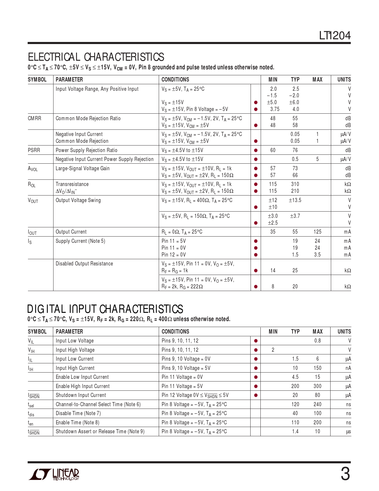 Input Voltage Range, Any Positive Input VS = ±5V, TA = 25°C 2.0 2.5 V – 1.5 – 2.0 V VS = ±15V ● ±5.0 ±6.0 V VS = ±15V, Pin 8 Voltage = – 5V ● 3.75 4.0 V CMRR Common Mode Rejection Ratio VS = ±5V, VCM = – 1.5V, 2V, TA = 25°C 48 55 dB VS = ±15V, VCM = ±5V ● 48 58 dB Negative Input Current VS = ±5V, VCM = – 1.5V, 2V, TA = 25°C 0.05 1 µA/V Common Mode Rejection VS = ±15V, VCM = ±5V ● 0.05 1 µA/V PSRR Power Supply Rejection Ratio VS = ±4.5V to ±15V ● 60 76 dB Negative Input Current Power Supply Rejection VS = ±4.5V to ±15V ● 0.5 5 µA/V AVOL Large-Signal Voltage Gain VS = ±15V, VOUT = ±10V, RL = 1k ● 57 73 dB VS = ±5V, VOUT = ±2V, RL = 150Ω ● 57 66 dB ROL Transresistance VS = ±15V, VOUT = ±10V, RL = 1k ● 115 310 kΩ ∆V – O /∆IIN VS = ±5V, VOUT = ±2V, RL = 150Ω ● 115 210 kΩ VOUT Output Voltage Swing VS = ±15V, RL = 400Ω, TA = 25°C ±12 ±13.5 V ● ±10 V VS = ±5V, RL = 150Ω, TA = 25°C ±3.0 ±3.7 V ● ±2.5 V IOUT Output Current RL = 0Ω, TA = 25°C 35 55 125 mA IS Supply Current (Note 5) Pin 11 = 5V ● 19 24 mA Pin 11 = 0V ● 19 24 mA Pin 12 = 0V ● 1.5 3.5 mA Disabled Output Resistance VS = ±15V, Pin 11 = 0V, VO = ±5V, RF = RG = 1k ● 14 25 kΩ VS = ±15V, Pin 11 = 0V, VO = ±5V, RF = 2k, RG = 222Ω ● 8 20 kΩ