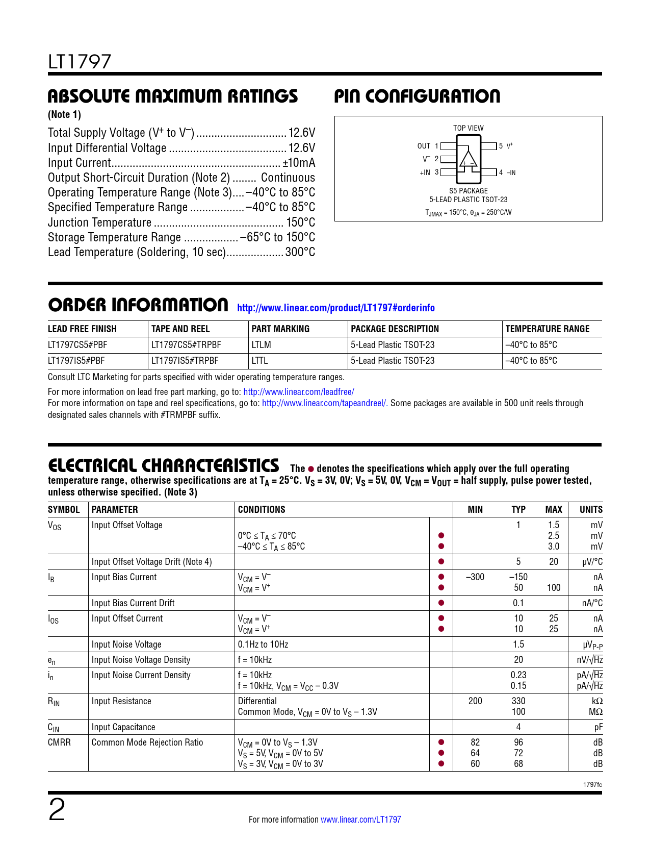 VOS Input Offset Voltage 1 1.5 mV 0°C ≤ TA ≤ 70°C l 2.5 mV –40°C ≤ TA ≤ 85°C l 3.0 mV Input Offset Voltage Drift (Note 4) l 5 20 µV/°C IB Input Bias Current VCM = V– l –300 –150 nA VCM = V+ l 50 100 nA Input Bias Current Drift l 0.1 nA/°C IOS Input Offset Current VCM = V– l 10 25 nA VCM = V+ l 10 25 nA Input Noise Voltage 0.1Hz to 10Hz 1.5 µVP-P en Input Noise Voltage Density f = 10kHz 20 nV/√Hz in Input Noise Current Density f = 10kHz 0.23 pA/√Hz f = 10kHz, VCM = VCC – 0.3V 0.15 pA/√Hz RIN Input Resistance Differential 200 330 kΩ Common Mode, VCM = 0V to VS – 1.3V 100 MΩ CIN Input Capacitance 4 pF CMRR Common Mode Rejection Ratio VCM = 0V to VS – 1.3V l 82 96 dB VS = 5V, VCM = 0V to 5V l 64 72 dB VS = 3V, VCM = 0V to 3V l 60 68 dB 1797fc 2 For more information www.linear.com/LT1797