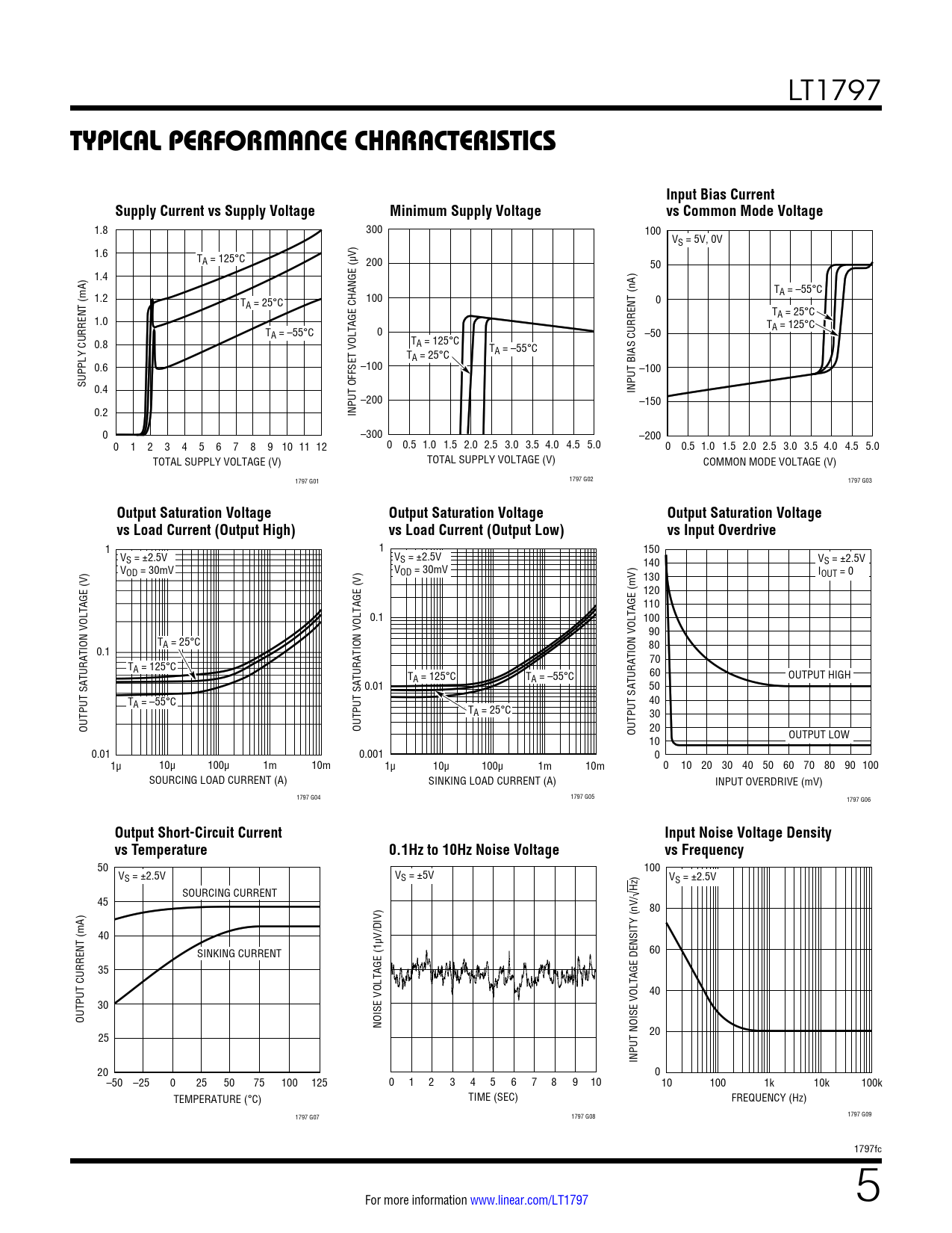 1 1 150 VS = ±2.5V VS = ±2.5V 140 VS = ±2.5V VOD = 30mV VOD = 30mV 130 IOUT = 0 120 110 0.1 100 90 TA = 25°C 0.1 80 70 TA = 125°C 60 T T OUTPUT HIGH A = 125°C A = –55°C 0.01 50 TA = –55°C 40 TA = 25°C 30 OUTPUT SATURATION VOLTAGE (V) OUTPUT SATURATION VOLTAGE (V) OUTPUT SATURATION VOLTAGE (mV) 20 10 OUTPUT LOW 0.01 0.001 0 1µ 10µ 100µ 1m 10m 1µ 10µ 100µ 1m 10m 0 10 20 30 40 50 60 70 80 90 100 SOURCING LOAD CURRENT (A) SINKING LOAD CURRENT (A) INPUT OVERDRIVE (mV) 1797 G04 1797 G05 1797 G06