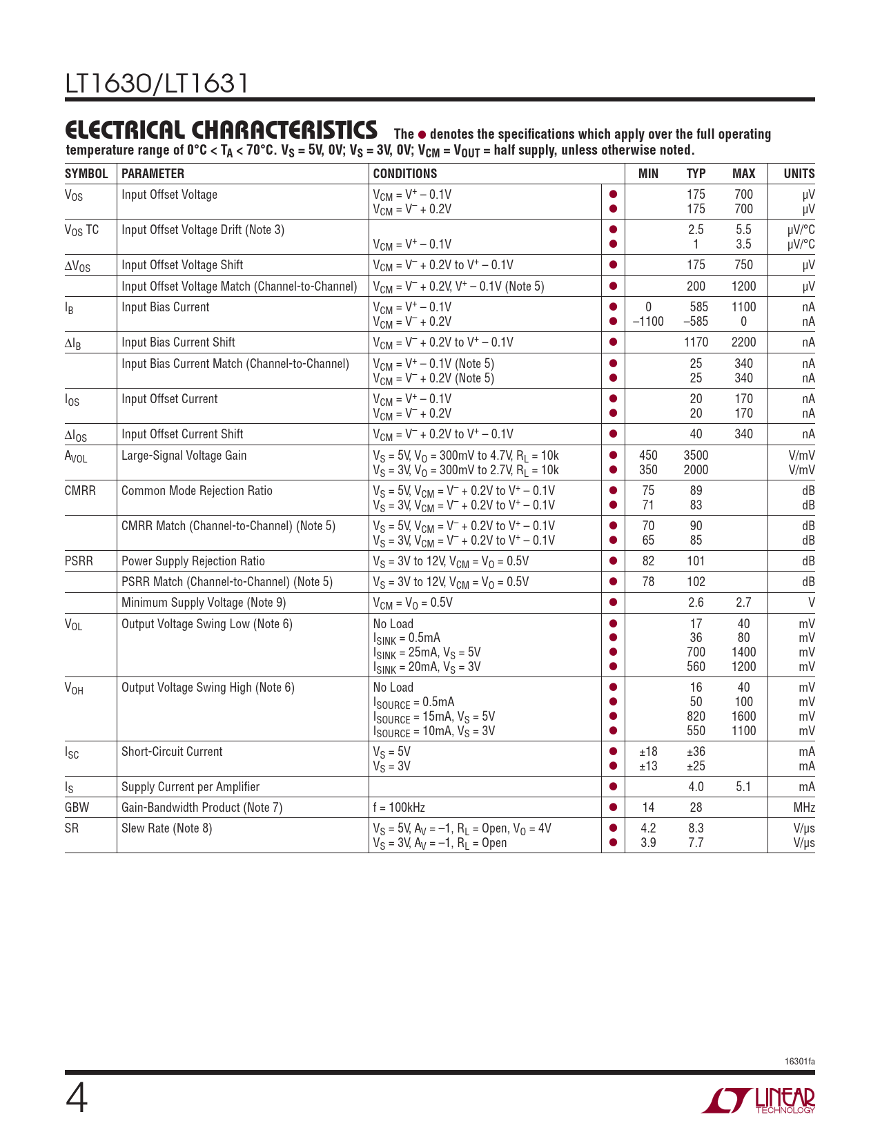 VOS Input Offset Voltage VCM = V+ – 0.1V l 175 700 µV VCM = V– + 0.2V l 175 700 µV VOS TC Input Offset Voltage Drift (Note 3) l 2.5 5.5 µV/°C VCM = V+ – 0.1V l 1 3.5 µV/°C ∆VOS Input Offset Voltage Shift VCM = V– + 0.2V to V+ – 0.1V l 175 750 µV Input Offset Voltage Match (Channel-to-Channel) VCM = V– + 0.2V, V+ – 0.1V (Note 5) l 200 1200 µV IB Input Bias Current VCM = V+ – 0.1V l 0 585 1100 nA VCM = V– + 0.2V l –1100 –585 0 nA ∆IB Input Bias Current Shift VCM = V– + 0.2V to V+ – 0.1V l 1170 2200 nA Input Bias Current Match (Channel-to-Channel) VCM = V+ – 0.1V (Note 5) l 25 340 nA VCM = V– + 0.2V (Note 5) l 25 340 nA IOS Input Offset Current VCM = V+ – 0.1V l 20 170 nA VCM = V– + 0.2V l 20 170 nA ∆IOS Input Offset Current Shift VCM = V– + 0.2V to V+ – 0.1V l 40 340 nA AVOL Large-Signal Voltage Gain VS = 5V, VO = 300mV to 4.7V, RL = 10k l 450 3500 V/mV VS = 3V, VO = 300mV to 2.7V, RL = 10k l 350 2000 V/mV CMRR Common Mode Rejection Ratio VS = 5V, VCM = V– + 0.2V to V+ – 0.1V l 75 89 dB VS = 3V, VCM = V– + 0.2V to V+ – 0.1V l 71 83 dB CMRR Match (Channel-to-Channel) (Note 5) VS = 5V, VCM = V– + 0.2V to V+ – 0.1V l 70 90 dB VS = 3V, VCM = V– + 0.2V to V+ – 0.1V l 65 85 dB PSRR Power Supply Rejection Ratio VS = 3V to 12V, VCM = VO = 0.5V l 82 101 dB PSRR Match (Channel-to-Channel) (Note 5) VS = 3V to 12V, VCM = VO = 0.5V l 78 102 dB Minimum Supply Voltage (Note 9) VCM = VO = 0.5V l 2.6 2.7 V VOL Output Voltage Swing Low (Note 6) No Load l 17 40 mV ISINK = 0.5mA l 36 80 mV ISINK = 25mA, VS = 5V l 700 1400 mV ISINK = 20mA, VS = 3V l 560 1200 mV VOH Output Voltage Swing High (Note 6) No Load l 16 40 mV ISOURCE = 0.5mA l 50 100 mV ISOURCE = 15mA, VS = 5V l 820 1600 mV ISOURCE = 10mA, VS = 3V l 550 1100 mV ISC Short-Circuit Current VS = 5V l ±18 ±36 mA VS = 3V l ±13 ±25 mA IS Supply Current per Amplifier l 4.0 5.1 mA GBW Gain-Bandwidth Product (Note 7) f = 100kHz l 14 28 MHz SR Slew Rate (Note 8) VS = 5V, AV = –1, RL = Open, VO = 4V l 4.2 8.3 V/µs VS = 3V, AV = –1, RL = Open l 3.9 7.7 V/µs 16301fa Document Outline Features Description Applications Typical Application Absolute Maximum Ratings Pin Configuration Order Information Electrical Characteristics Typical Performance Characteristics Applications Information Package Description Typical Application Related Parts