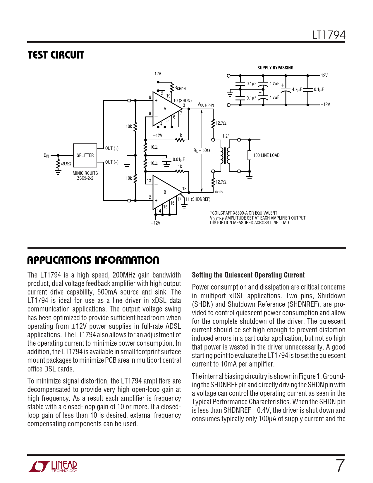 LT1794 TEST CIRCUITSUPPLY BYPASSING 12V 12V + 0.1µF 4.7µF + RSHDN 0.1µF 2 + 4.7µF 9 19 + 0.1µF 4.7µF 10 (SHDN) 3 VOUT(P-P) –12V A 8 7 – 6 5 4 12.7Ω 10k –12V 1k 1:2* 110 OUT (+) Ω RL ≈ 50Ω EIN SPLITTER 100 LINE LOAD 0.01µF OUT (–) 49.9Ω 110Ω 1k MINICIRCUITS ZSC5-2-2 10k 13 12.7Ω – 18 1794 TC B 12 17 11 (SHDNREF) + 16 15 14 *COILCRAFT X8390-A OR EQUIVALENT VOUTP-P AMPLITUDE SET AT EACH AMPLIFIER OUTPUT –12V DISTORTION MEASURED ACROSS LINE LOAD UUWUAPPLICATIO S I FOR ATIO The LT1794 is a high speed, 200MHz gain bandwidth Setting the Quiescent Operating Current product, dual voltage feedback amplifier with high output Power consumption and dissipation are critical concerns current drive capability, 500mA source and sink. The in multiport xDSL applications. Two pins, Shutdown LT1794 is ideal for use as a line driver in xDSL data (SHDN) and Shutdown Reference (SHDNREF), are pro- communication applications. The output voltage swing vided to control quiescent power consumption and allow has been optimized to provide sufficient headroom when for the complete shutdown of the driver. The quiescent operating from ±12V power supplies in full-rate ADSL current should be set high enough to prevent distortion applications. The LT1794 also allows for an adjustment of induced errors in a particular application, but not so high the operating current to minimize power consumption. In that power is wasted in the driver unnecessarily. A good addition, the LT1794 is available in small footprint surface starting point to evaluate the LT1794 is to set the quiescent mount packages to minimize PCB area in multiport central current to 10mA per amplifier. office DSL cards. The internal biasing circuitry is shown in Figure 1. Ground- To minimize signal distortion, the LT1794 amplifiers are ing the SHDNREF pin and directly driving the SHDN pin with decompensated to provide very high open-loop gain at a voltage can control the operating current as seen in the high frequency. As a result each amplifier is frequency Typical Performance Characteristics. When the SHDN pin stable with a closed-loop gain of 10 or more. If a closed- is less than SHDNREF + 0.4V, the driver is shut down and loop gain of less than 10 is desired, external frequency consumes typically only 100µA of supply current and the compensating components can be used. 7