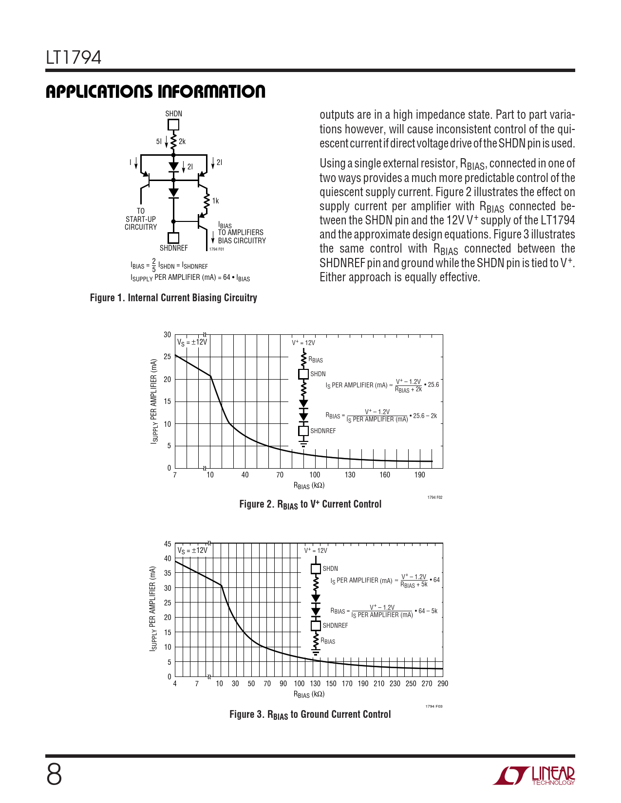 SHDN outputs are in a high impedance state. Part to part varia- tions however, will cause inconsistent control of the qui- 5I 2k escent current if direct voltage drive of the SHDN pin is used. I 2I 2I Using a single external resistor, RBIAS, connected in one of two ways provides a much more predictable control of the quiescent supply current. Figure 2 illustrates the effect on 1k supply current per amplifier with R TO BIAS connected be- START-UP tween the SHDN pin and the 12V V+ supply of the LT1794 CIRCUITRY IBIAS TO AMPLIFIERS and the approximate design equations. Figure 3 illustrates BIAS CIRCUITRY SHDNREF 1794 F01 the same control with RBIAS connected between the 2 IBIAS = ISHDN = ISHDNREF SHDNREF pin and ground while the SHDN pin is tied to V+. 5 ISUPPLY PER AMPLIFIER (mA) = 64 • IBIAS Either approach is equally effective.