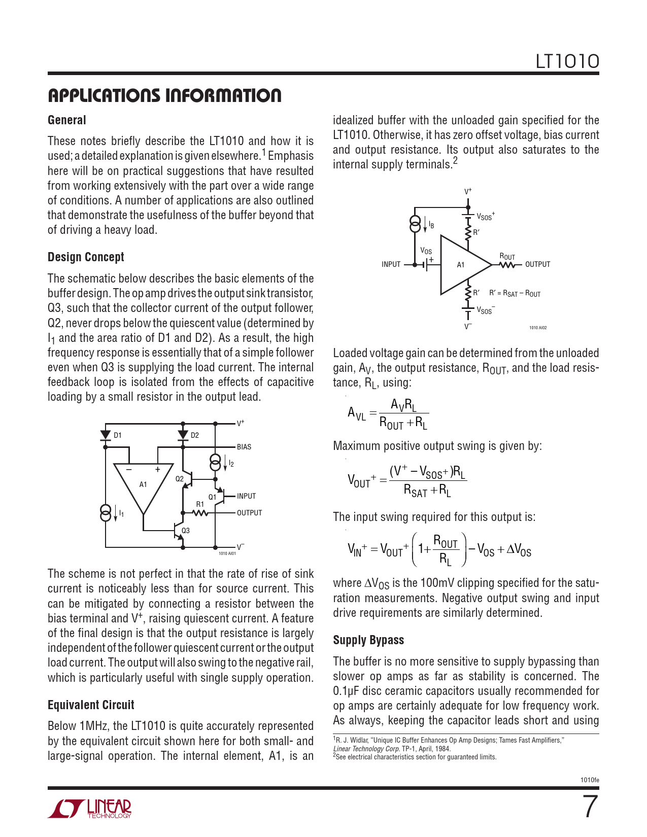 LT1010 APPLICATIONS INFORMATION General idealized buffer with the unloaded gain specified for the These notes briefly describe the LT1010 and how it is LT1010. Otherwise, it has zero offset voltage, bias current used; a detailed explanation is given elsewhere.1 Emphasis and output resistance. Its output also saturates to the here will be on practical suggestions that have resulted internal supply terminals.2 from working extensively with the part over a wide range V+ of conditions. A number of applications are also outlined that demonstrate the usefulness of the buffer beyond that V + SOS of driving a heavy load. IB R′ Design Concept VOS ROUT + INPUT A1 OUTPUT The schematic below describes the basic elements of the buffer design. The op amp drives the output sink transistor, R′ R′ = RSAT – ROUT Q3, such that the collector current of the output follower, V – SOS Q2, never drops below the quiescent value (determined by V– 1010 AI02 I1 and the area ratio of D1 and D2). As a result, the high frequency response is essentially that of a simple follower Loaded voltage gain can be determined from the unloaded even when Q3 is supplying the load current. The internal gain, AV , the output resistance, ROUT, and the load resis- feedback loop is isolated from the effects of capacitive tance, RL, using: loading by a small resistor in the output lead. A A VRL VL = V+ ROUT +RL D1 D2 BIAS Maximum positive output swing is given by: – + I2 (V+ – V Q2 V + = SOS+ )RL A1 OUT R Q1 INPUT SAT + RL R1 I1 OUTPUT The input swing required for this output is: Q3 R V– V + = V + 1+ OUT 1010 AI01 IN OUT RL – VOS + ∆VOS The scheme is not perfect in that the rate of rise of sink current is noticeably less than for source current. This where ∆VOS is the 100mV clipping specified for the satu- can be mitigated by connecting a resistor between the ration measurements. Negative output swing and input bias terminal and V+, raising quiescent current. A feature drive requirements are similarly determined. of the final design is that the output resistance is largely independent of the follower quiescent current or the output Supply Bypass load current. The output will also swing to the negative rail, The buffer is no more sensitive to supply bypassing than which is particularly useful with single supply operation. slower op amps as far as stability is concerned. The 0.1µF disc ceramic capacitors usually recommended for Equivalent Circuit op amps are certainly adequate for low frequency work. Below 1MHz, the LT1010 is quite accurately represented As always, keeping the capacitor leads short and using by the equivalent circuit shown here for both small- and 1R. J. Widlar, “Unique IC Buffer Enhances Op Amp Designs; Tames Fast Amplifiers,” large-signal operation. The internal element, A1, is an Linear Technology Corp. TP-1, April, 1984. 2See electrical characteristics section for guaranteed limits. 1010fe 7 Document Outline Fteatures Applications Description Typical Application Absolute Maximum Ratings Preconditioning Pin Configuration Order Information Electrical Characteristics Typical Performance Characteristics Applications Information Schematic Diagram Definition Of Terms Package Description Revision History Related Parts