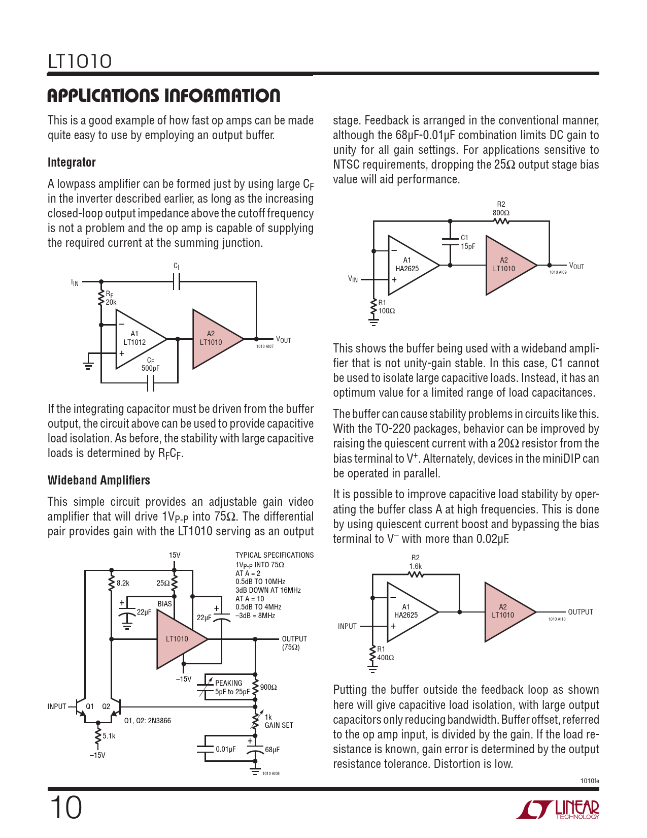 LT1010 APPLICATIONS INFORMATION This is a good example of how fast op amps can be made stage. Feedback is arranged in the conventional manner, quite easy to use by employing an output buffer. although the 68µF-0.01µF combination limits DC gain to unity for all gain settings. For applications sensitive to Integrator NTSC requirements, dropping the 25Ω output stage bias A lowpass amplifier can be formed just by using large C value will aid performance. F in the inverter described earlier, as long as the increasing R2 closed-loop output impedance above the cutoff frequency 800Ω is not a problem and the op amp is capable of supplying the required current at the summing junction. C1 15pF – A1 A2 CI HA2625 LT1010 VOUT 1010 AI09 I V + IN IN RF 20k R1 100Ω – A1 A2 LT1012 LT1010 VOUT 1010 AI07 + This shows the buffer being used with a wideband ampli- CF fier that is not unity-gain stable. In this case, C1 cannot 500pF be used to isolate large capacitive loads. Instead, it has an optimum value for a limited range of load capacitances. If the integrating capacitor must be driven from the buffer The buffer can cause stability problems in circuits like this. output, the circuit above can be used to provide capacitive With the TO-220 packages, behavior can be improved by load isolation. As before, the stability with large capacitive raising the quiescent current with a 20Ω resistor from the loads is determined by RFCF . bias terminal to V+. Alternately, devices in the miniDIP can Wideband Amplifiers be operated in parallel. This simple circuit provides an adjustable gain video It is possible to improve capacitive load stability by oper- amplifier that will drive 1V ating the buffer class A at high frequencies. This is done P-P into 75Ω. The differential pair provides gain with the LT1010 serving as an output by using quiescent current boost and bypassing the bias terminal to V– with more than 0.02µF. 15V TYPICAL SPECIFICATIONS R2 1VP-P INTO 75Ω 1.6k AT A = 2 8.2k 25Ω 0.5dB TO 10MHz 3dB DOWN AT 16MHz + AT A = 10 – BIAS 0.5dB TO 4MHz A1 A2 22µF + OUTPUT 22µF –3dB = 8MHz HA2625 LT1010 1010 AI10 INPUT + LT1010 OUTPUT (75Ω) R1 400Ω –15V PEAKING 5pF to 25pF 900Ω Putting the buffer outside the feedback loop as shown INPUT Q1 Q2 here will give capacitive load isolation, with large output 1k Q1, Q2: 2N3866 capacitors only reducing bandwidth. Buffer offset, referred GAIN SET 5.1k + to the op amp input, is divided by the gain. If the load re- 0.01µF 68µF sistance is known, gain error is determined by the output –15V resistance tolerance. Distortion is low. 1010 AI08 1010fe 10 Document Outline Fteatures Applications Description Typical Application Absolute Maximum Ratings Preconditioning Pin Configuration Order Information Electrical Characteristics Typical Performance Characteristics Applications Information Schematic Diagram Definition Of Terms Package Description Revision History Related Parts