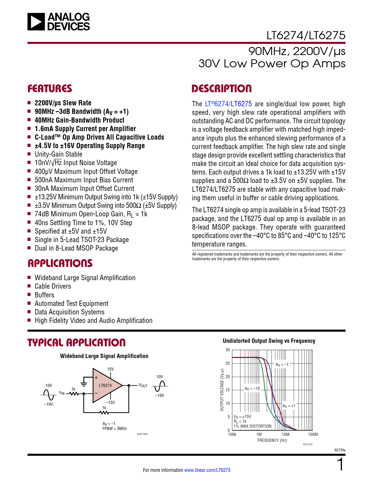 LT6274/LT6275 90MHz, 2200V/µs 30V Low Power Op Amps FEATURESDESCRIPTION n 2200V/μs Slew Rate The LT®6274/LT6275 are single/dual low power, high n 90MHz –3dB Bandwidth (AV = +1) speed, very high slew rate operational amplifiers with n 40MHz Gain-Bandwidth Product outstanding AC and DC performance. The circuit topology n 1.6mA Supply Current per Amplifier is a voltage feedback amplifier with matched high imped- n C-Load™ Op Amp Drives All Capacitive Loads ance inputs plus the enhanced slewing performance of a n ±4.5V to ±16V Operating Supply Range current feedback amplifier. The high slew rate and single n Unity-Gain Stable stage design provide excellent settling characteristics that n 10nV/√Hz Input Noise Voltage make the circuit an ideal choice for data acquisition sys- n 400µV Maximum Input Offset Voltage tems. Each output drives a 1k load to ±13.25V with ±15V n 500nA Maximum Input Bias Current supplies and a 500Ω load to ±3.5V on ±5V supplies. The n 30nA Maximum Input Offset Current LT6274/LT6275 are stable with any capacitive load mak- n ±13.25V Minimum Output Swing into 1k (±15V Supply) ing them useful in buffer or cable driving applications. n ±3.5V Minimum Output Swing into 500Ω (±5V Supply) The LT6274 single op amp is available in a 5-lead TSOT-23 n 74dB Minimum Open-Loop Gain, RL = 1k package, and the LT6275 dual op amp is available in an n 40ns Settling Time to 1%, 10V Step 8-lead MSOP package. They operate with guaranteed n Specified at ±5V and ±15V specifications over the –40°C to 85°C and –40°C to 125°C n Single in 5-Lead TSOT-23 Package temperature ranges. n Dual in 8-Lead MSOP Package All registered trademarks and trademarks are the property of their respective owners. All other APPLICATIONS trademarks are the property of their respective owners. n Wideband Large Signal Amplification n Cable Drivers n Buffers n Automated Test Equipment n Data Acquisition Systems n High Fidelity Video and Audio Amplification TYPICAL APPLICATIONUndistorted Output Swing vs Frequency 30 Wideband Large Signal Amplification 25 AV = –1 15V ) + P-P 10V 20 10V LT6274 VOUT 1k TAGE (V A 15 V = –10 VIN – –10V –15V –10V 10 1k AV = +1 OUTPUT VOL 5 VS = ±15V A R V = –1 L = 1k FPBW = 3MHz 1% MAX DISTORTION 0 6275 TA01 100k 1M 10M 100M FREQUENCY (Hz) 6275 G31 6275fa For more information www.linear.com/LT6275 1