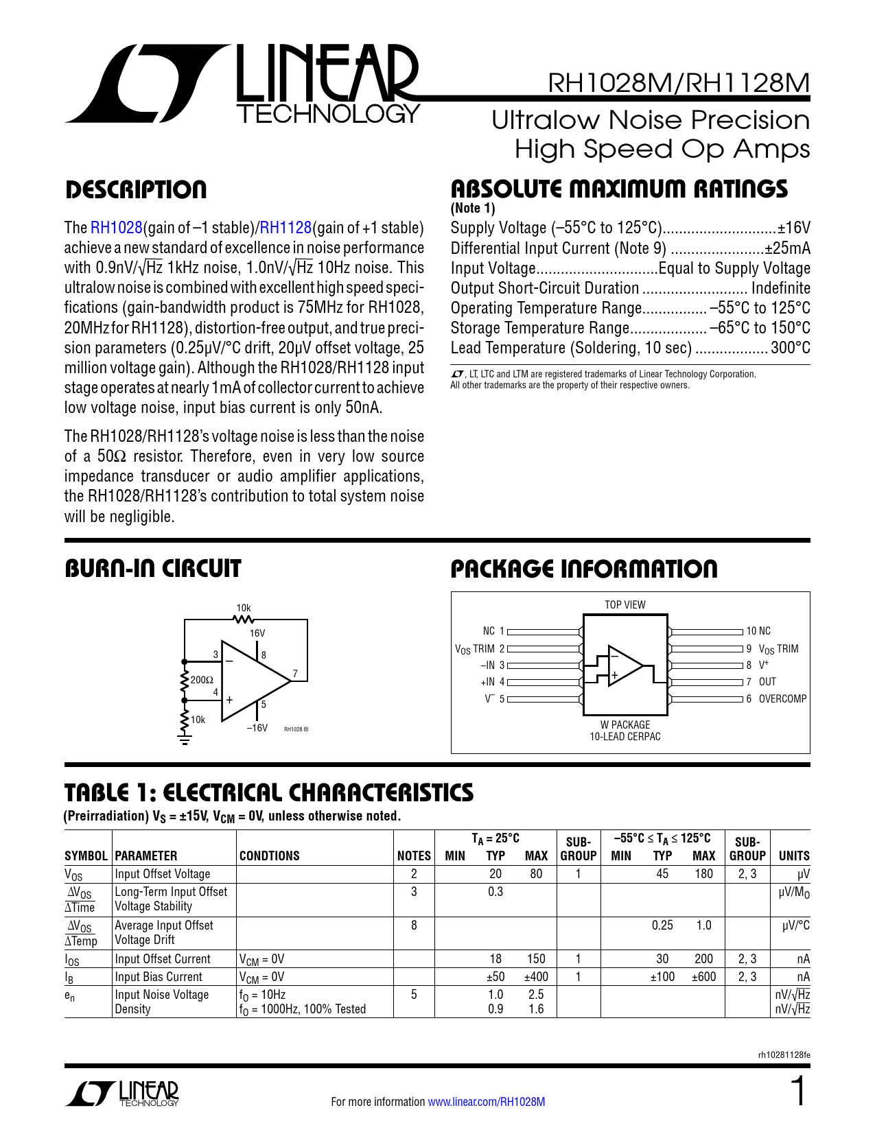 RH1028M/RH1128M Ultralow Noise Precision High Speed Op Amps DescriptionAbsolute MAxiMuM rAtings(Note 1) The RH1028(gain of –1 stable)/RH1128(gain of +1 stable) Supply Voltage (–55°C to 125°C)..±16V achieve a new standard of excellence in noise performance Differential Input Current (Note 9) ...±25mA with 0.9nV/√Hz 1kHz noise, 1.0nV/√Hz 10Hz noise. This Input Voltage ..Equal to Supply Voltage ultralow noise is combined with excellent high speed speci- Output Short-Circuit Duration .. Indefinite fications (gain-bandwidth product is 75MHz for RH1028, Operating Temperature Range.. –55°C to 125°C 20MHz for RH1128), distortion-free output, and true preci- Storage Temperature Range ... –65°C to 150°C sion parameters (0.25µV/°C drift, 20µV offset voltage, 25 Lead Temperature (Soldering, 10 sec) .. 300°C million voltage gain). Although the RH1028/RH1128 input L, LT, LTC and LTM are registered trademarks of Linear Technology Corporation. stage operates at nearly 1mA of collector current to achieve All other trademarks are the property of their respective owners. low voltage noise, input bias current is only 50nA. The RH1028/RH1128’s voltage noise is less than the noise of a 50Ω resistor. Therefore, even in very low source impedance transducer or audio amplifier applications, the RH1028/RH1128’s contribution to total system noise will be negligible. burn-in circuitpAcKAge inForMAtion 10k TOP VIEW 16V NC 1 10 NC – 3 – 8 VOS TRIM 2 9 VOS TRIM –IN 3 + 8 V+ 7 200Ω +IN 4 7 OUT 4 + 5 V– 5 6 OVERCOMP 10k –16V W PACKAGE RH1028 BI 10-LEAD CERPAC tAble 1: electricAl chArActeristics(Preirradiation) VS = ±15V, VCM = 0V, unless otherwise noted.TA = 25°CSUB-–55°C ≤ TA ≤ 125°CSUB-SYMBOL PARAMETERCONDTIONSNOTES MINTYPMAX GROUP MINTYPMAX GROUP UNITS VOS Input Offset Voltage 2 20 80 1 45 180 2, 3 µV ∆VOS Long-Term Input Offset 3 0.3 µV/MO ∆Time Voltage Stability ∆VOS Average Input Offset 8 0.25 1.0 µV/°C ∆Temp Voltage Drift IOS Input Offset Current VCM = 0V 18 150 1 30 200 2, 3 nA IB Input Bias Current VCM = 0V ±50 ±400 1 ±100 ±600 2, 3 nA en Input Noise Voltage fO = 10Hz 5 1.0 2.5 nV/√Hz Density fO = 1000Hz, 100% Tested 0.9 1.6 nV/√Hz rh10281128fe For more information www.linear.com/RH1028M 1 Document Outline Description Electrical Characteristics