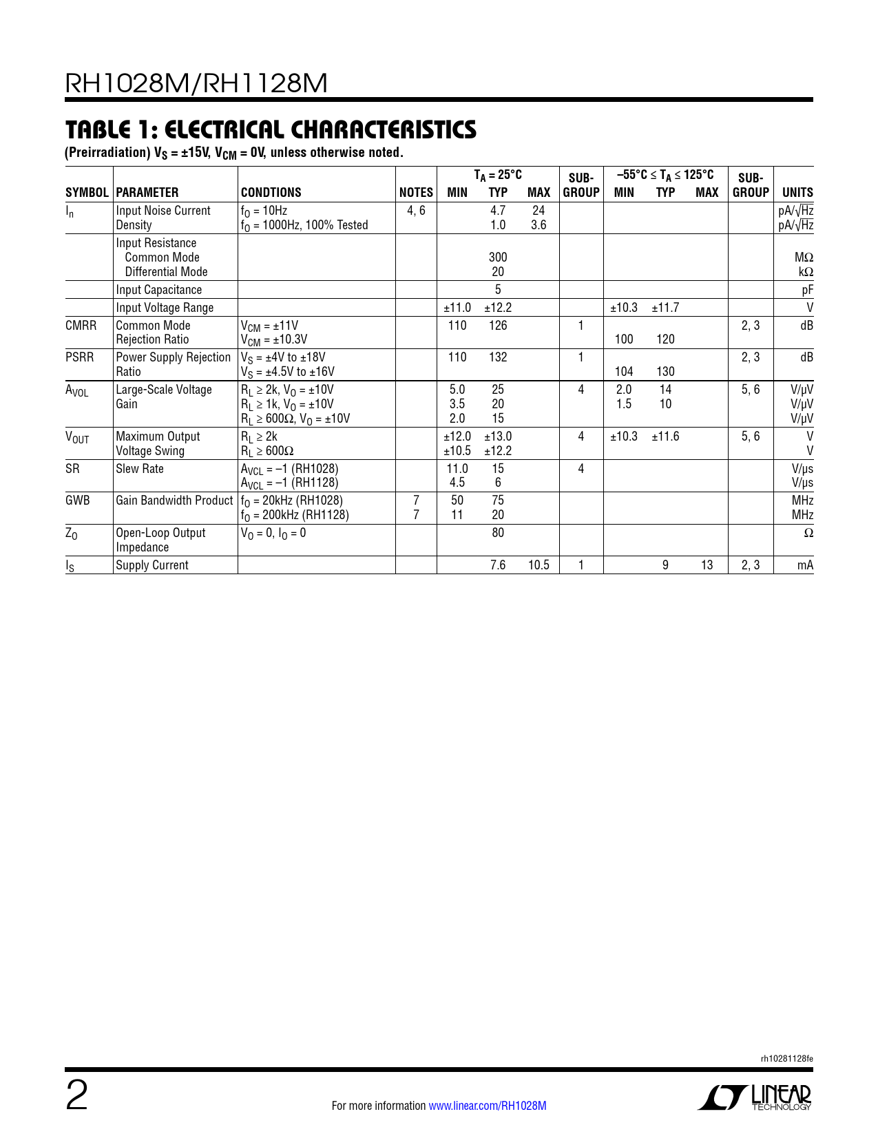 Datasheet RH1028M, RH1128M (Analog Devices) - 2
