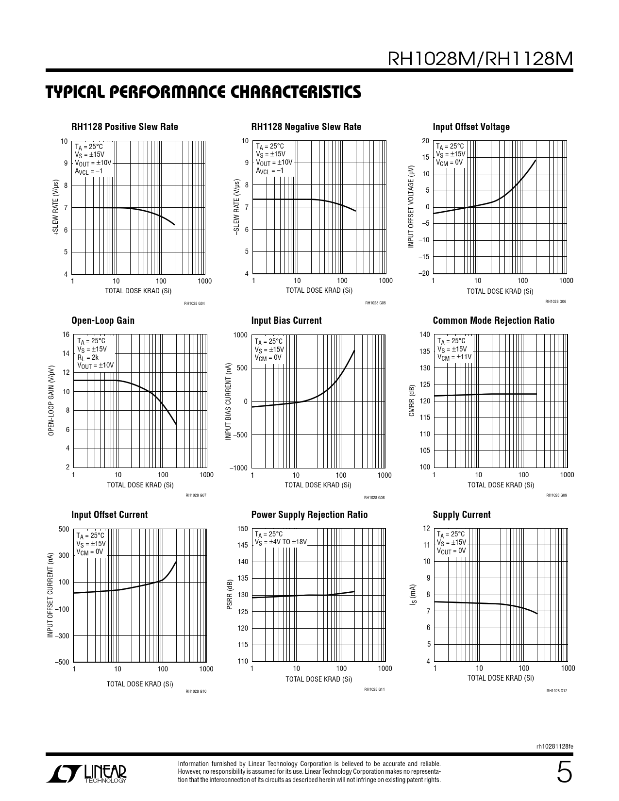 RH1028M/RH1128M tYpicAl perForMAnce chArActeristicsRH1128 Positive Slew RateRH1128 Negative Slew RateInput Offset Voltage 10 10 20 TA = 25°C TA = 25°C TA = 25°C VS = ±15V VS = ±15V 15 VS = ±15V 9 VOUT = ±10V 9 VOUT = ±10V VCM = 0V AVCL = –1 AVCL = –1 V) 10 /µs) 8 /µs) 8 TAGE (µ 5 TE (V TE (V 7 7 0 –5 +SLEW RA 6 –SLEW RA 6 –10 INPUT OFFSET VOL 5 5 –15 4 4 –20 1 10 100 1000 1 10 100 1000 1 10 100 1000 TOTAL DOSE KRAD (Si) TOTAL DOSE KRAD (Si) TOTAL DOSE KRAD (Si) RH1028 G04 RH1028 G05 RH1028 G06 Open-Loop GainInput Bias CurrentCommon Mode Rejection Ratio 16 1000 140 TA = 25°C TA = 25°C TA = 25°C V V 14 S = ±15V VS = ±15V 135 S = ±15V RL = 2k VCM = 0V VCM = ±11V V) VOUT = ±10V 500 130 /µ 12 125 10 0 120 8 CMRR (dB) 115 OPEN-LOOP GAIN (V 6 INPUT BIAS CURRENT (nA) –500 110 4 105 2 –1000 100 1 10 100 1000 1 10 100 1000 1 10 100 1000 TOTAL DOSE KRAD (Si) TOTAL DOSE KRAD (Si) TOTAL DOSE KRAD (Si) RH1028 G07 RH1028 G08 RH1028 G09 Input Offset CurrentPower Supply Rejection RatioSupply Current 500 150 12 TA = 25°C TA = 25°C TA = 25°C VS = ±15V 145 VS = ±4V TO ±18V 11 VS = ±15V V 300 VCM = 0V OUT = 0V 140 10 100 135 9 130 (mA) 8 I S –100 PSRR (dB) 125 7 120 6 INPUT OFFSET CURRENT (nA) –300 115 5 –500 110 4 1 10 100 1000 1 10 100 1000 1 10 100 1000 TOTAL DOSE KRAD (Si) TOTAL DOSE KRAD (Si) TOTAL DOSE KRAD (Si) RH1028 G10 RH1028 G11 RH1028 G12 rh10281128fe Information furnished by Linear Technology Corporation is believed to be accurate and reliable. However, no responsibility is assumed for its use. Linear Technology Corporation makes no representa- tion that the inter For m connection or of e i its nf cirorm cuits ation www. as described linear. herein com will /R not H1028 infringe M on existing patent rights. 5 Document Outline Description Electrical Characteristics