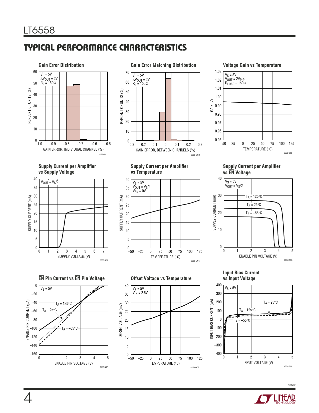 0 40 400 V V S = 5V VS = 5V S = 5V –20 35 VIN = 2.5V 300 –40 T 30 µA) µA) 200 T A = 125°C A = 25°C –60 TA = 25°C 25 100 TA = 125°C –80 20 0 TA = –55°C –100 TA = –55°C 15 –100 OFFSET VOTLAGE (mV) –120 10 –200 ENABLE PIN CURRENT ( INPUT BIAS CURRENT ( –140 5 –300 –160 0 –400 0 1 2 3 4 5 –50 –25 0 25 50 75 100 125 0 1 2 3 4 5 ENABLE PIN VOLTAGE (V) TEMPERATURE (°C) INPUT VOLTAGE (V) 6558 G07 6558 G09 6558 G08 6558f 4