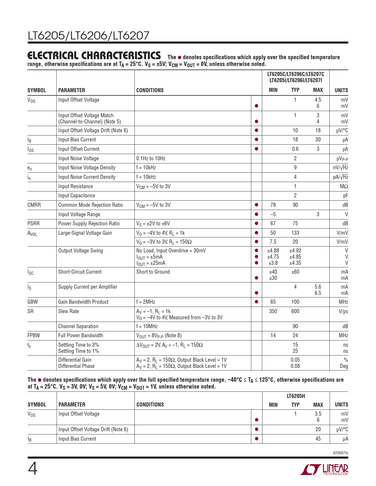 denotes specifi cations which apply over the full specifi ed temperature range, –40°C ≤ TA ≤ 125°C, otherwise specifi cations are at TA = 25°C. VS = 3V, 0V; VS = 5V, 0V; VCM = VOUT = 1V, unless otherwise noted. LT6205H SYMBOL PARAMETER CONDITIONS MIN TYP MAX UNITS