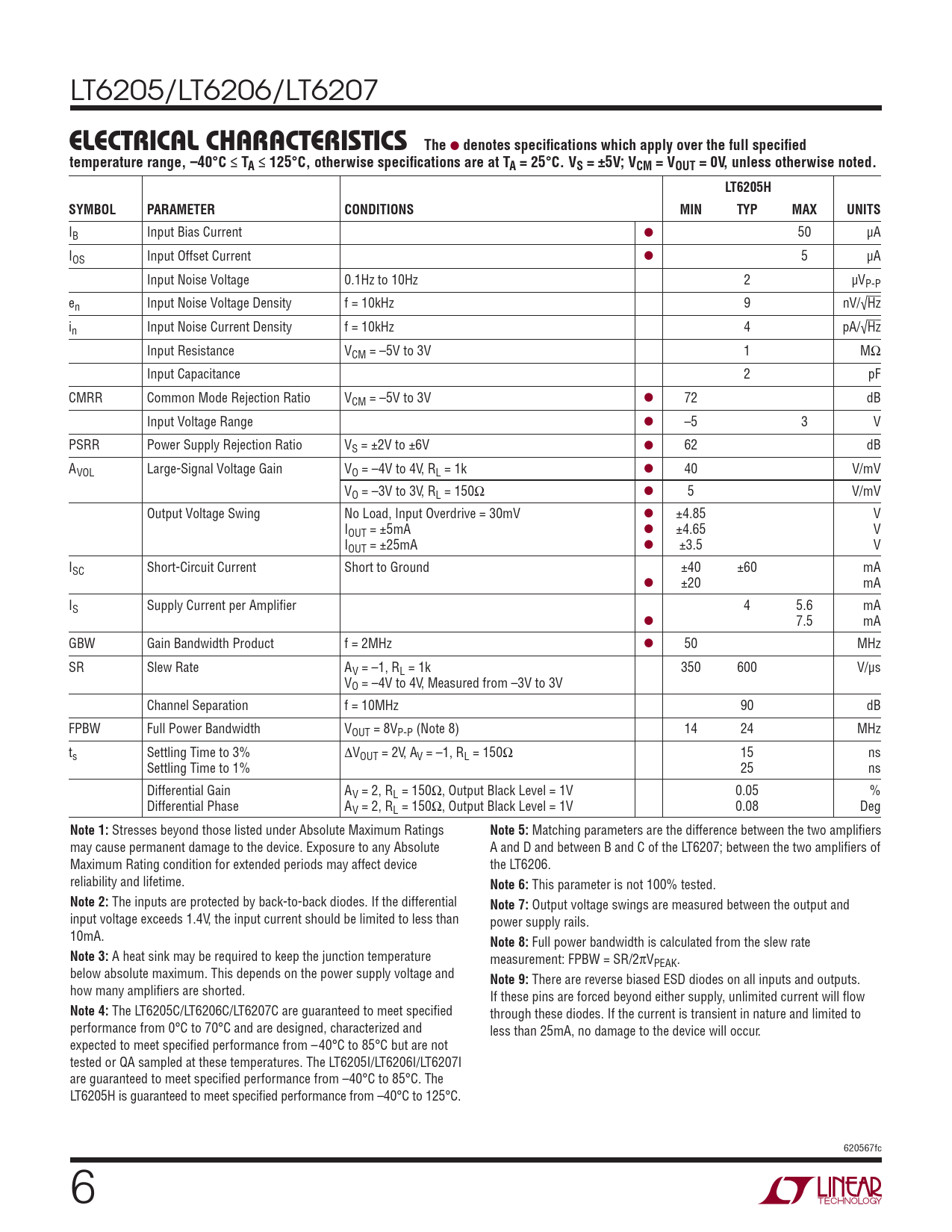 LT6205/LT6206/LT6207 ELECTRICAL CHARACTERISTICSThe l denotes specifi cations which apply over the full specifi edtemperature range, –40°C ≤ TA ≤ 125°C, otherwise specifi cations are at TA = 25°C. VS = ±5V; VCM = VOUT = 0V, unless otherwise noted.LT6205HSYMBOLPARAMETERCONDITIONSMINTYPMAXUNITS IB Input Bias Current l 50 μA IOS Input Offset Current l 5 μA Input Noise Voltage 0.1Hz to 10Hz 2 μVP-P en Input Noise Voltage Density f = 10kHz 9 nV/√Hz in Input Noise Current Density f = 10kHz 4 pA/√Hz Input Resistance VCM = –5V to 3V 1 MΩ Input Capacitance 2 pF CMRR Common Mode Rejection Ratio VCM = –5V to 3V l 72 dB Input Voltage Range l –5 3 V PSRR Power Supply Rejection Ratio VS = ±2V to ±6V l 62 dB AVOL Large-Signal Voltage Gain VO = –4V to 4V, RL = 1k l 40 V/mV VO = –3V to 3V, RL = 150Ω l 5 V/mV Output Voltage Swing No Load, Input Overdrive = 30mV l ±4.85 V IOUT = ±5mA l ±4.65 V IOUT = ±25mA l ±3.5 V ISC Short-Circuit Current Short to Ground ±40 ±60 mA l ±20 mA IS Supply Current per Amplifi er 4 5.6 mA l 7.5 mA GBW Gain Bandwidth Product f = 2MHz l 50 MHz SR Slew Rate AV = –1, RL = 1k 350 600 V/μs VO = –4V to 4V, Measured from –3V to 3V Channel Separation f = 10MHz 90 dB FPBW Full Power Bandwidth VOUT = 8VP-P (Note 8) 14 24 MHz ts Settling Time to 3% ΔVOUT = 2V, AV = –1, RL = 150Ω 15 ns Settling Time to 1% 25 ns Differential Gain AV = 2, RL = 150Ω, Output Black Level = 1V 0.05 % Differential Phase AV = 2, RL = 150Ω, Output Black Level = 1V 0.08 Deg Note 1: Stresses beyond those listed under Absolute Maximum Ratings Note 5: Matching parameters are the difference between the two amplifi ers may cause permanent damage to the device. Exposure to any Absolute A and D and between B and C of the LT6207; between the two amplifi ers of Maximum Rating condition for extended periods may affect device the LT6206. reliability and lifetime. Note 6: This parameter is not 100% tested. Note 2: The inputs are protected by back-to-back diodes. If the differential Note 7: Output voltage swings are measured between the output and input voltage exceeds 1.4V, the input current should be limited to less than power supply rails. 10mA. Note 8: Full power bandwidth is calculated from the slew rate Note 3: A heat sink may be required to keep the junction temperature measurement: FPBW = SR/2πVPEAK. below absolute maximum. This depends on the power supply voltage and Note 9: There are reverse biased ESD diodes on all inputs and outputs. how many amplifi ers are shorted. If these pins are forced beyond either supply, unlimited current will fl ow Note 4: The LT6205C/LT6206C/LT6207C are guaranteed to meet specifi ed through these diodes. If the current is transient in nature and limited to performance from 0°C to 70°C and are designed, characterized and less than 25mA, no damage to the device will occur. expected to meet specifi ed performance from –40°C to 85°C but are not tested or QA sampled at these temperatures. The LT6205I/LT6206I/LT6207I are guaranteed to meet specifi ed performance from –40°C to 85°C. The LT6205H is guaranteed to meet specifi ed performance from –40°C to 125°C. 620567fc 6 Document Outline FEATURES DESCRIPTION APPLICATIONS TYPICAL APPLICATION ABSOLUTE MAXIMUM RATINGS PIN CONFIGURATION ORDER INFORMATION ELECTRICAL CHARACTERISTICS TYPICAL PERFORMANCE CHARACTERISTICS APPLICATIONS INFORMATION TYPICAL APPLICATION PACKAGE DESCRIPTION REVISION HISTORY TYPICAL APPLICATION RELATED PARTS
