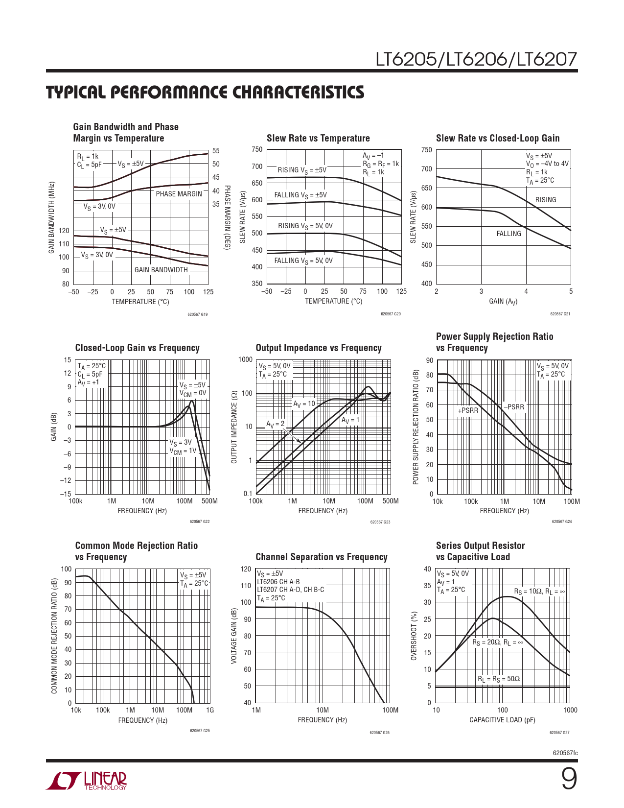 LT6205/LT6206/LT6207 TYPICAL PERFORMANCE CHARACTERISTICSGain Bandwidth and Phase Margin vs TemperatureSlew Rate vs TemperatureSlew Rate vs Closed-Loop Gain 55 750 750 R A V L = 1k V = –1 S = p5V C V 50 R V L = 5pF S = p5V 700 G = RF = 1k O = –4V to 4V RISING V 700 S = p5V RL = 1k R 45 L = 1k PHASE MARGIN (DEG) 650 TA = 25°C 40 650 PHASE MARGIN FALLING V /μs) 600 S = p5V /μs) RISING 35 VS = 3V, 0V 600 TE (V 550 TE (V RISING V 550 120 V S = 5V, 0V S = p5V 500 FALLING 110 SLEW RA SLEW RA 500 GAIN BANDWIDTH (MHz) 450 100 VS = 3V, 0V FALLING VS = 5V, 0V 400 450 90 GAIN BANDWIDTH 80 350 400 –50 –25 0 25 50 75 100 125 –50 –25 0 25 50 75 100 125 2 3 4 5 TEMPERATURE (°C) TEMPERATURE (°C) GAIN (AV) 620567 G19 620567 G20 620567 G21 Power Supply Rejection RatioClosed-Loop Gain vs FrequencyOutput Impedance vs Frequencyvs Frequency 15 1000 90 TA = 25°C VS = 5V, 0V VS = 5V, 0V 12 CL = 5pF TA = 25°C 80 TA = 25°C A 9 V = +1 VS = p5V V TIO (dB) 70 CM = 0V 100 6 AV = 10 60 –PSRR 3 +PSRR AV = 1 50 0 10 AV = 2 40 GAIN (dB) –3 V Y REJECTION RA S = 3V 30 –6 VCM = 1V OUTPUT IMPEDANCE (Ω) 1 –9 20 –12 POWER SUPPL 10 –15 0.1 0 100k 1M 10M 100M 500M 100k 1M 10M 100M 500M 10k 100k 1M 10M 100M FREQUENCY (Hz) FREQUENCY (Hz) FREQUENCY (Hz) 620567 G22 620567 G23 620567 G24 Common Mode Rejection RatioSeries Output Resistorvs FrequencyChannel Separation vs Frequencyvs Capacitive Load 100 120 40 V V V S = p5V S = p5V S = 5V, 0V 90 T LT6206 CH A-B A A = 25°C 110 35 V = 1 LT6207 CH A-D, CH B-C TA = 25°C RS = 10Ω, RL = d TIO (dB) 80 T 100 A = 25°C 30 70 90 25 60 50 80 20 RS = 20Ω, RL = d 40 TAGE GAIN (dB) 70 15 OVERSHOOT (%) 30 VOL 60 10 20 RL = RS = 50Ω 50 5 COMMON MODE REJECTION RA 10 0 40 0 10k 100k 1M 10M 100M 1G 1M 10M 100M 10 100 1000 FREQUENCY (Hz) FREQUENCY (Hz) CAPACITIVE LOAD (pF) 620567 G25 620567 G26 620567 G27 620567fc 9 Document Outline FEATURES DESCRIPTION APPLICATIONS TYPICAL APPLICATION ABSOLUTE MAXIMUM RATINGS PIN CONFIGURATION ORDER INFORMATION ELECTRICAL CHARACTERISTICS TYPICAL PERFORMANCE CHARACTERISTICS APPLICATIONS INFORMATION TYPICAL APPLICATION PACKAGE DESCRIPTION REVISION HISTORY TYPICAL APPLICATION RELATED PARTS