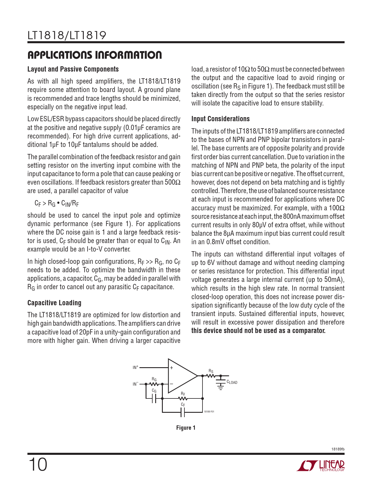 sipation signifi cantly because of the low duty cycle of the The LT1818/LT1819 are optimized for low distortion and transient inputs. Sustained differential inputs, however, high gain bandwidth applications. The amplifi ers can drive will result in excessive power dissipation and therefore a capacitive load of 20pF in a unity-gain confi guration and