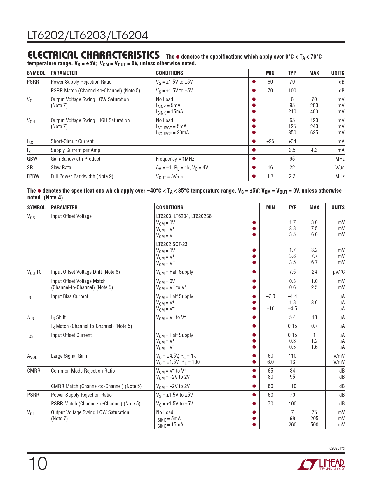 PSRR Power Supply Rejection Ratio VS = ±1.5V to ±5V l 60 70 dB PSRR Match (Channel-to-Channel) (Note 5) VS = ±1.5V to ±5V l 70 100 dB VOL Output Voltage Swing LOW Saturation No Load l 6 70 mV (Note 7) ISINK = 5mA l 95 200 mV ISINK = 15mA l 210 400 mV VOH Output Voltage Swing HIGH Saturation No Load l 65 120 mV (Note 7) ISOURCE = 5mA l 125 240 mV ISOURCE = 20mA l 350 625 mV ISC Short-Circuit Current l ±25 ±34 mA IS Supply Current per Amp l 3.5 4.3 mA GBW Gain Bandwidth Product Frequency = 1MHz l 95 MHz SR Slew Rate AV = –1, RL = 1k, VO = 4V l 16 22 V/µs FPBW Full Power Bandwidth (Note 9) VOUT = 3VP-P l 1.7 2.3 MHz