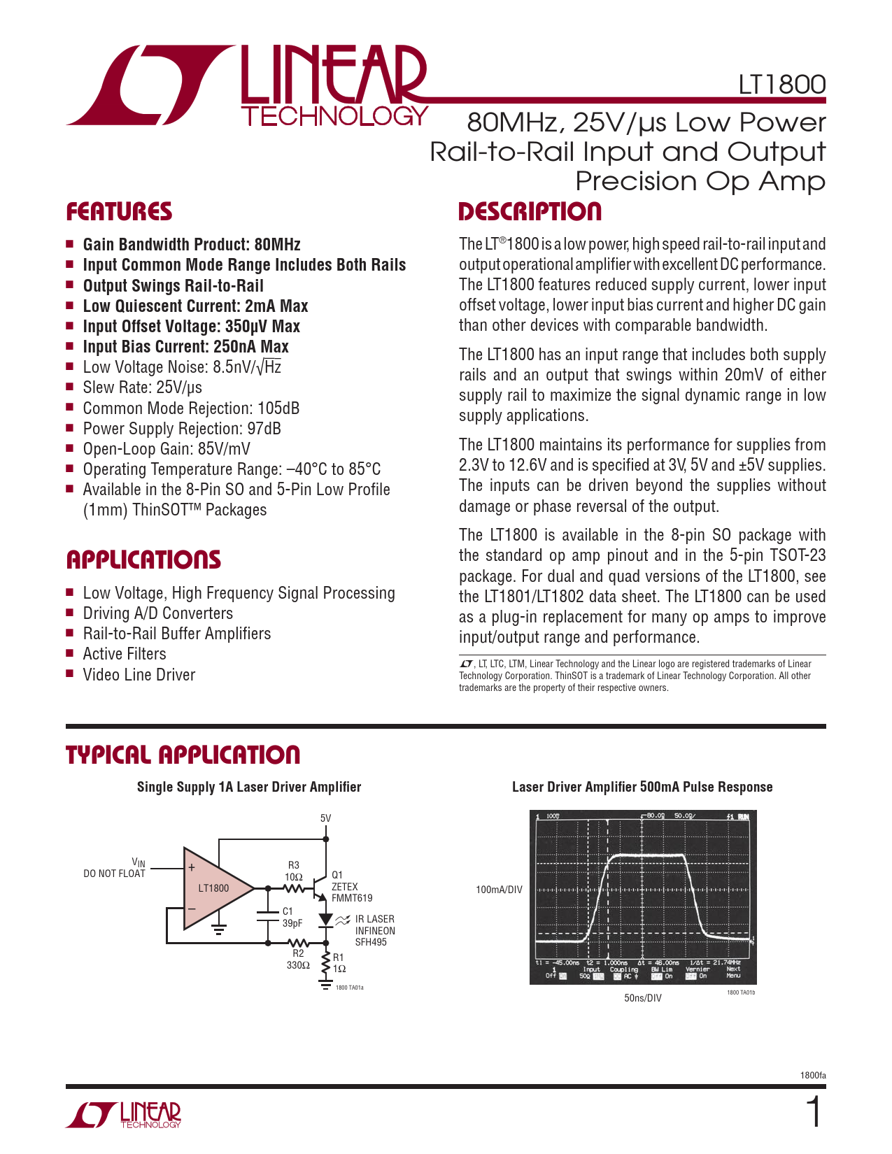 LT1800 80MHz, 25V/µs Low Power Rail-to-Rail Input and Output Precision Op Amp FEATURESDESCRIPTION n Gain Bandwidth Product: 80MHz The LT®1800 is a low power, high speed rail-to-rail input and n Input Common Mode Range Includes Both Rails output operational amplifi er with excellent DC performance. n Output Swings Rail-to-Rail The LT1800 features reduced supply current, lower input n Low Quiescent Current: 2mA Max offset voltage, lower input bias current and higher DC gain n Input Offset Voltage: 350μV Max than other devices with comparable bandwidth. n Input Bias Current: 250nA Max The LT1800 has an input range that includes both supply n Low Voltage Noise: 8.5nV/√Hz rails and an output that swings within 20mV of either n Slew Rate: 25V/μs supply rail to maximize the signal dynamic range in low n Common Mode Rejection: 105dB supply applications. n Power Supply Rejection: 97dB n The LT1800 maintains its performance for supplies from Open-Loop Gain: 85V/mV n 2.3V to 12.6V and is specifi ed at 3V, 5V and ±5V supplies. Operating Temperature Range: –40°C to 85°C n The inputs can be driven beyond the supplies without Available in the 8-Pin SO and 5-Pin Low Profi le damage or phase reversal of the output. (1mm) ThinSOT™ Packages The LT1800 is available in the 8-pin SO package with the standard op amp pinout and in the 5-pin TSOT-23 APPLICATIONS package. For dual and quad versions of the LT1800, see n Low Voltage, High Frequency Signal Processing the LT1801/LT1802 data sheet. The LT1800 can be used n Driving A/D Converters as a plug-in replacement for many op amps to improve n Rail-to-Rail Buffer Amplifi ers input/output range and performance. n Active Filters L, LT, LTC, LTM, Linear Technology and the Linear logo are registered trademarks of Linear n Video Line Driver Technology Corporation. ThinSOT is a trademark of Linear Technology Corporation. All other trademarks are the property of their respective owners. TYPICAL APPLICATIONSingle Supply 1A Laser Driver Amplifi erLaser Driver Amplifi er 500mA Pulse Response 5V V + IN R3 DO NOT FLOAT Q1 10Ω LT1800 ZETEX 100mA/DIV – FMMT619 C1 IR LASER 39pF INFINEON SFH495 R2 R1 330Ω 1Ω 1800 TA01a 1800 TA01b 50ns/DIV 1800fa 1
