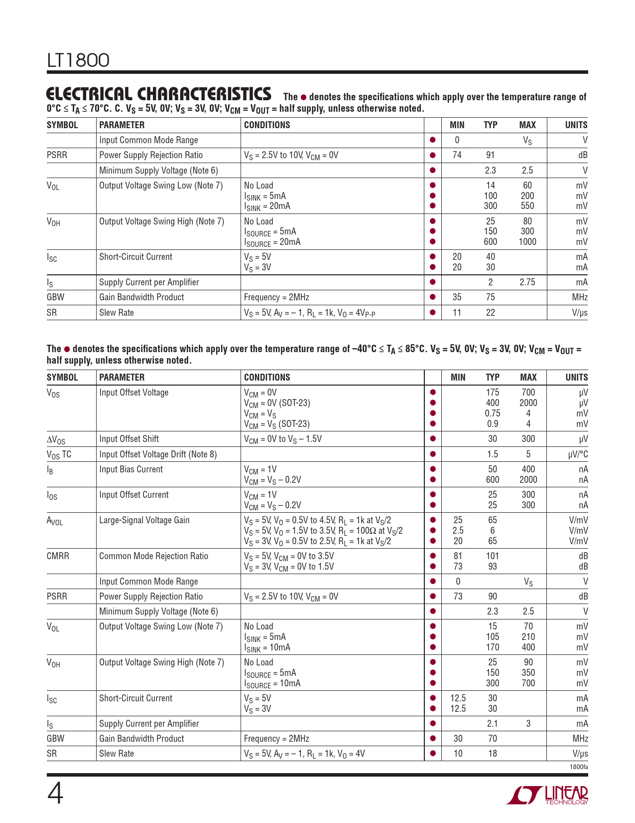 LT1800 ELECTRICAL CHARACTERISTICSThe l denotes the specifi cations which apply over the temperature range of0°C ≤ TA ≤ 70°C. C. VS = 5V, 0V; VS = 3V, 0V; VCM = VOUT = half supply, unless otherwise noted.SYMBOLPARAMETERCONDITIONSMINTYPMAXUNITS Input Common Mode Range l 0 VS V PSRR Power Supply Rejection Ratio VS = 2.5V to 10V, VCM = 0V l 74 91 dB Minimum Supply Voltage (Note 6) l 2.3 2.5 V VOL Output Voltage Swing Low (Note 7) No Load l 14 60 mV ISINK = 5mA l 100 200 mV ISINK = 20mA l 300 550 mV VOH Output Voltage Swing High (Note 7) No Load l 25 80 mV ISOURCE = 5mA l 150 300 mV ISOURCE = 20mA l 600 1000 mV ISC Short-Circuit Current VS = 5V l 20 40 mA VS = 3V l 20 30 mA IS Supply Current per Amplifi er l 2 2.75 mA GBW Gain Bandwidth Product Frequency = 2MHz l 35 75 MHz SR Slew Rate VS = 5V, AV = – 1, RL = 1k, VO = 4VP-P l 11 22 V/μs The l denotes the specifi cations which apply over the temperature range of –40°C ≤ TA ≤ 85°C. VS = 5V, 0V; VS = 3V, 0V; VCM = VOUT =half supply, unless otherwise noted.SYMBOLPARAMETERCONDITIONSMINTYPMAXUNITS VOS Input Offset Voltage VCM = 0V l 175 700 μV VCM = 0V (SOT-23) l 400 2000 μV VCM = VS l 0.75 4 mV VCM = VS (SOT-23) l 0.9 4 mV ΔVOS Input Offset Shift VCM = 0V to VS – 1.5V l 30 300 μV VOS TC Input Offset Voltage Drift (Note 8) l 1.5 5 μV/°C IB Input Bias Current VCM = 1V l 50 400 nA VCM = VS – 0.2V l 600 2000 nA IOS Input Offset Current VCM = 1V l 25 300 nA VCM = VS – 0.2V l 25 300 nA AVOL Large-Signal Voltage Gain VS = 5V, VO = 0.5V to 4.5V, RL = 1k at VS/2 l 25 65 V/mV VS = 5V, VO = 1.5V to 3.5V, RL = 100Ω at VS/2 l 2.5 6 V/mV VS = 3V, VO = 0.5V to 2.5V, RL = 1k at VS/2 l 20 65 V/mV CMRR Common Mode Rejection Ratio VS = 5V, VCM = 0V to 3.5V l 81 101 dB VS = 3V, VCM = 0V to 1.5V l 73 93 dB Input Common Mode Range l 0 VS V PSRR Power Supply Rejection Ratio VS = 2.5V to 10V, VCM = 0V l 73 90 dB Minimum Supply Voltage (Note 6) l 2.3 2.5 V VOL Output Voltage Swing Low (Note 7) No Load l 15 70 mV ISINK = 5mA l 105 210 mV ISINK = 10mA l 170 400 mV VOH Output Voltage Swing High (Note 7) No Load l 25 90 mV ISOURCE = 5mA l 150 350 mV ISOURCE = 10mA l 300 700 mV ISC Short-Circuit Current VS = 5V l 12.5 30 mA VS = 3V l 12.5 30 mA IS Supply Current per Amplifi er l 2.1 3 mA GBW Gain Bandwidth Product Frequency = 2MHz l 30 70 MHz SR Slew Rate VS = 5V, AV = – 1, RL = 1k, VO = 4V l 10 18 V/μs 1800fa 4