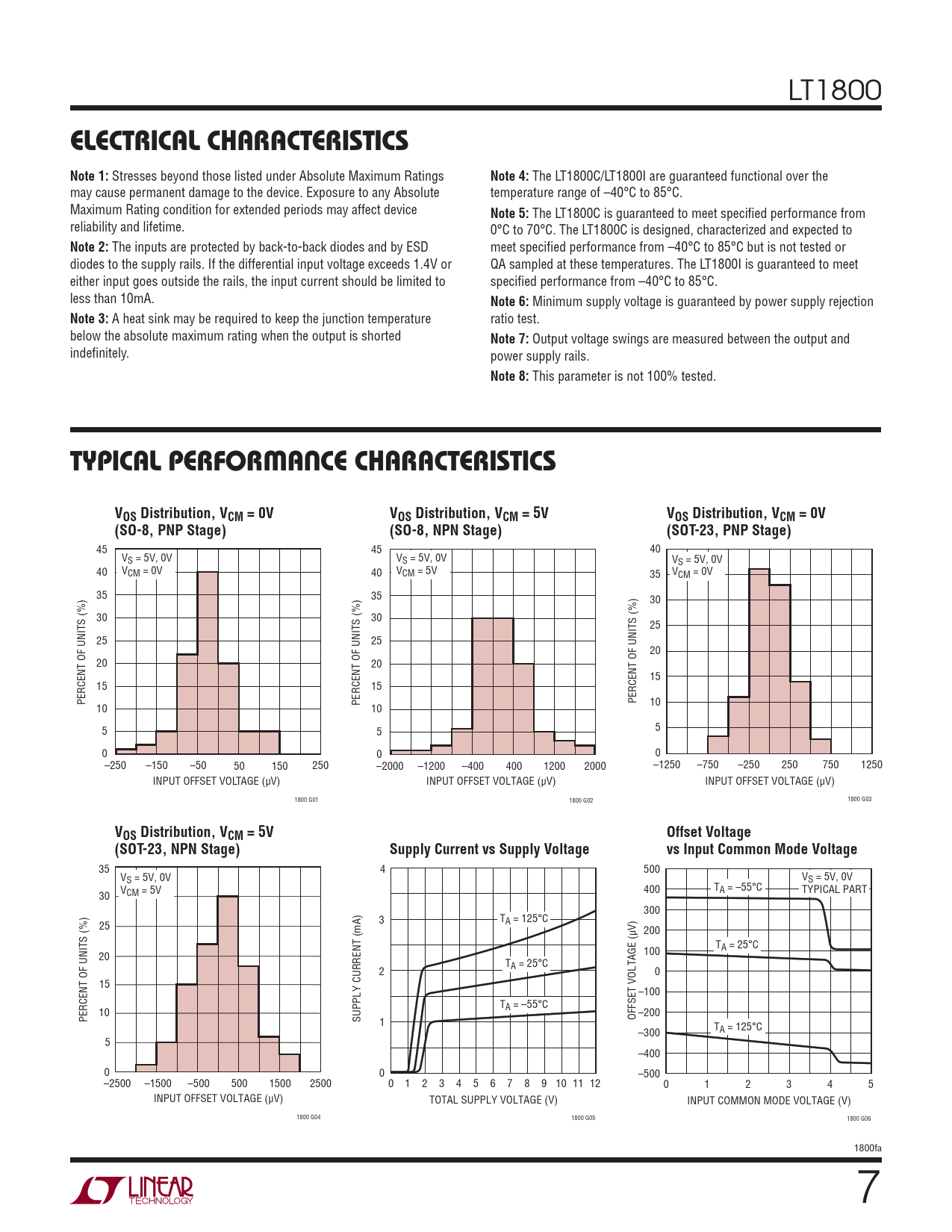 LT1800 ELECTRICAL CHARACTERISTICSNote 1: Stresses beyond those listed under Absolute Maximum Ratings Note 4: The LT1800C/LT1800I are guaranteed functional over the may cause permanent damage to the device. Exposure to any Absolute temperature range of –40°C to 85°C. Maximum Rating condition for extended periods may affect device Note 5: The LT1800C is guaranteed to meet specifi ed performance from reliability and lifetime. 0°C to 70°C. The LT1800C is designed, characterized and expected to Note 2: The inputs are protected by back-to-back diodes and by ESD meet specifi ed performance from –40°C to 85°C but is not tested or diodes to the supply rails. If the differential input voltage exceeds 1.4V or QA sampled at these temperatures. The LT1800I is guaranteed to meet either input goes outside the rails, the input current should be limited to specifi ed performance from –40°C to 85°C. less than 10mA. Note 6: Minimum supply voltage is guaranteed by power supply rejection Note 3: A heat sink may be required to keep the junction temperature ratio test. below the absolute maximum rating when the output is shorted Note 7: Output voltage swings are measured between the output and indefi nitely. power supply rails. Note 8: This parameter is not 100% tested. TYPICAL PERFORMANCE CHARACTERISTICSVOS Distribution, VCM = 0VVOS Distribution, VCM = 5VVOS Distribution, VCM = 0V(SO-8, PNP Stage)(SO-8, NPN Stage)(SOT-23, PNP Stage) 45 45 40 VS = 5V, 0V VS = 5V, 0V VS = 5V, 0V 40 VCM = 0V 40 VCM = 5V 35 VCM = 0V 35 35 30 30 30 25 25 25 20 20 20 15 15 15 PERCENT OF UNITS (%) PERCENT OF UNITS (%) PERCENT OF UNITS (%) 10 10 10 5 5 5 0 0 0 –250 –150 –50 50 150 250 –2000 –1200 –400 400 1200 2000 –1250 –750 –250 250 750 1250 INPUT OFFSET VOLTAGE (μV) INPUT OFFSET VOLTAGE (μV) INPUT OFFSET VOLTAGE (μV) 1800 G01 1800 G02 1800 G03 VOS Distribution, VCM = 5VOffset Voltage(SOT-23, NPN Stage)Supply Current vs Supply Voltagevs Input Common Mode Voltage 35 4 500 VS = 5V, 0V VS = 5V, 0V V 400 TA = –55°C TYPICAL PART 30 CM = 5V 300 3 T 25 A = 125°C 200 T 100 A = 25°C 20 T 2 A = 25°C 0 15 –100 TA = –55°C 10 –200 PERCENT OF UNITS (%) SUPPLY CURRENT (mA) OFFSET VOLTAGE (μV) 1 T –300 A = 125°C 5 –400 0 0 –500 –2500 –1500 –500 500 1500 2500 0 1 2 3 4 5 6 7 8 9 10 11 12 0 1 2 3 4 5 INPUT OFFSET VOLTAGE (μV) TOTAL SUPPLY VOLTAGE (V) INPUT COMMON MODE VOLTAGE (V) 1800 G04 1800 G05 1800 G06 1800fa 7