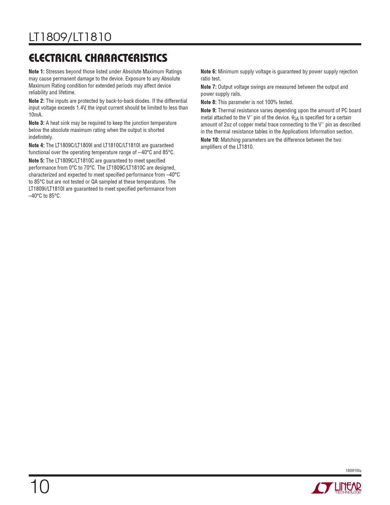 The LT1809C/LT1810C are guaranteed to meet specifi ed performance from 0°C to 70°C. The LT1809C/LT1810C are designed, characterized and expected to meet specifi ed performance from –40°C to 85°C but are not tested or QA sampled at these temperatures. The LT1809I/LT1810I are guaranteed to meet specifi ed performance from –40°C to 85°C. 180910fa 10